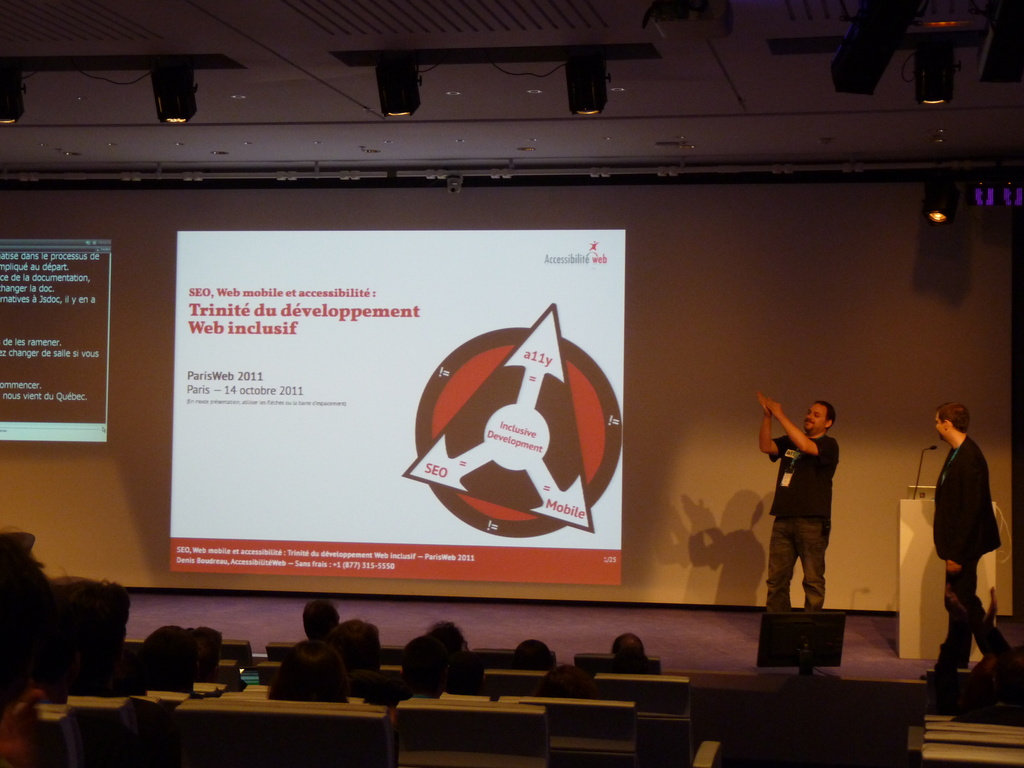 Changement de salle pour suivre Denis Boudreau présentant « SEO, mobilité et accessibilité : la sainte trinité d’un développement Web inclusif« .