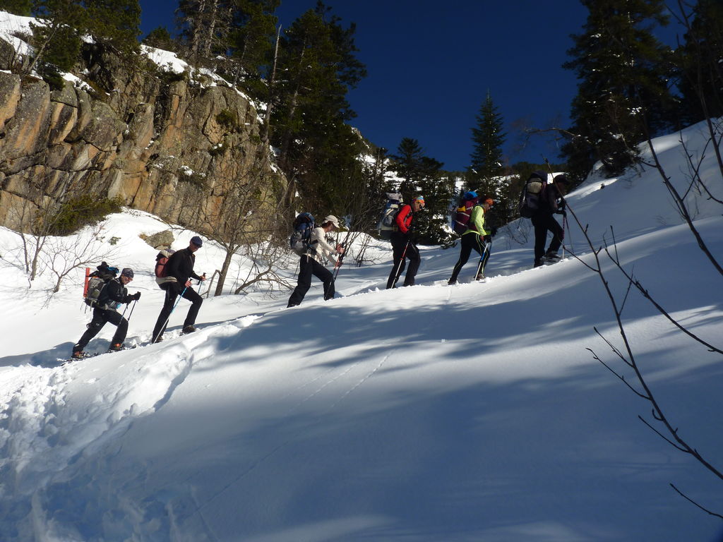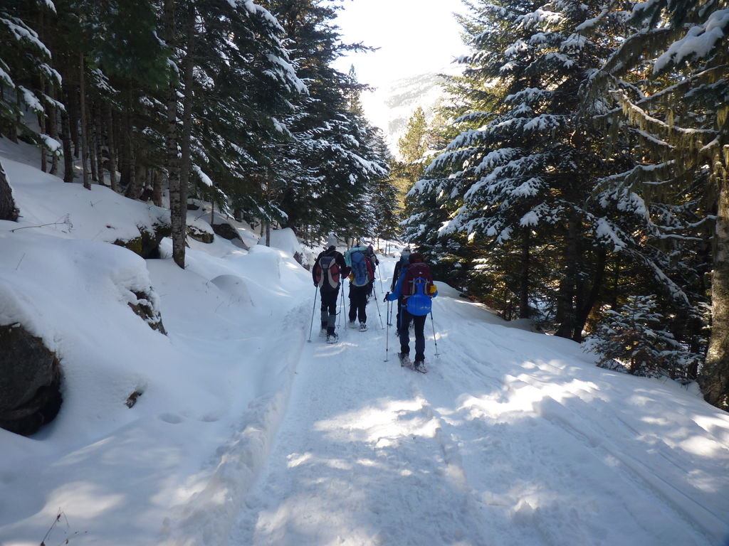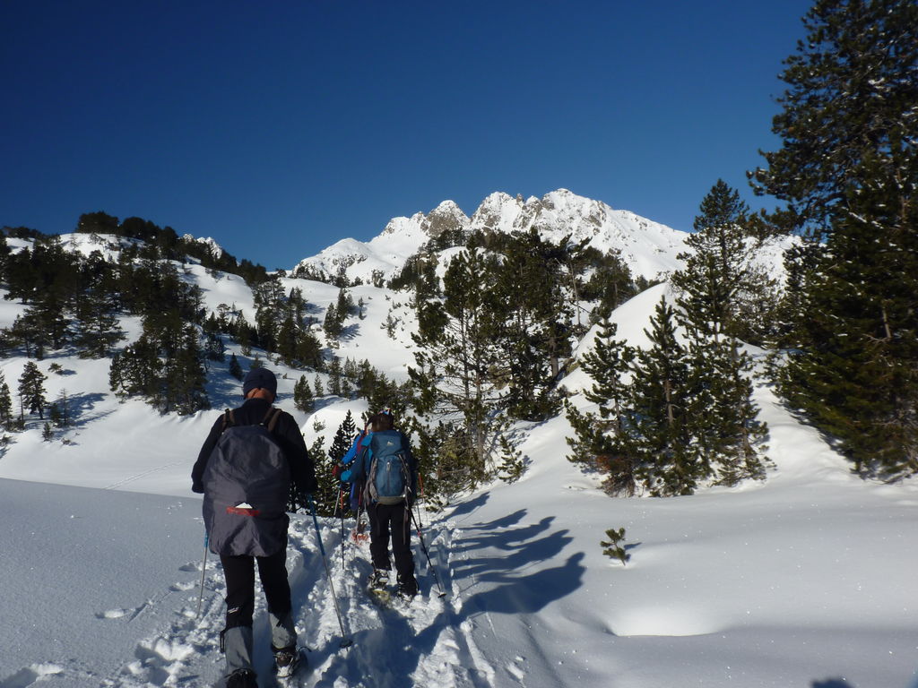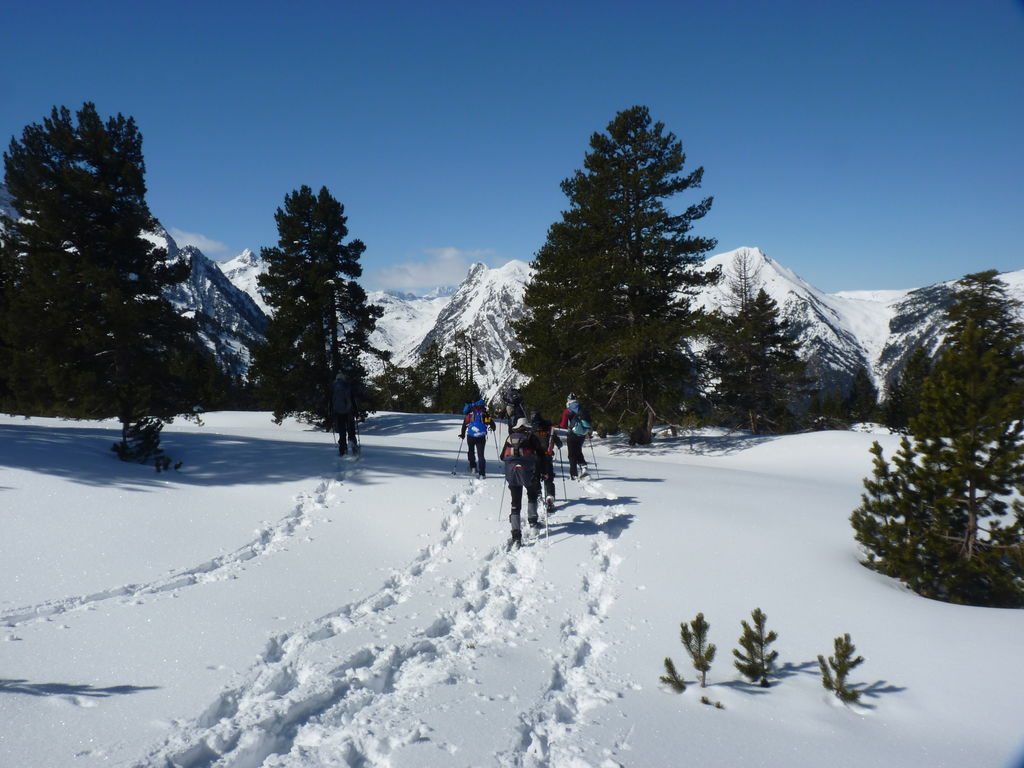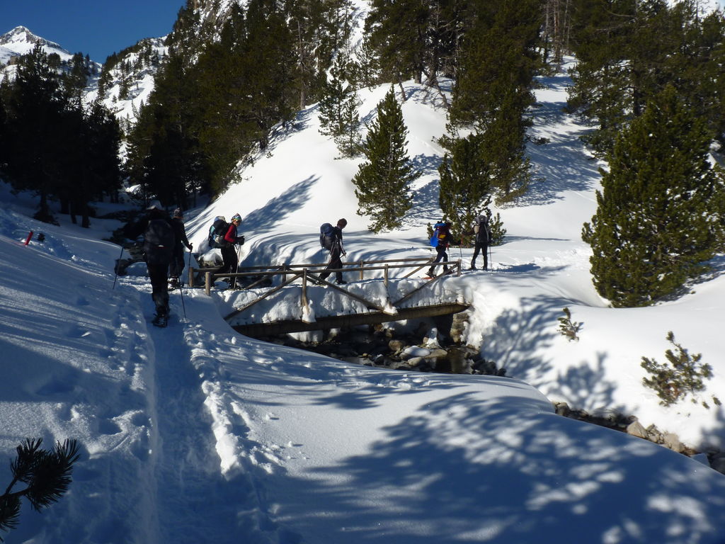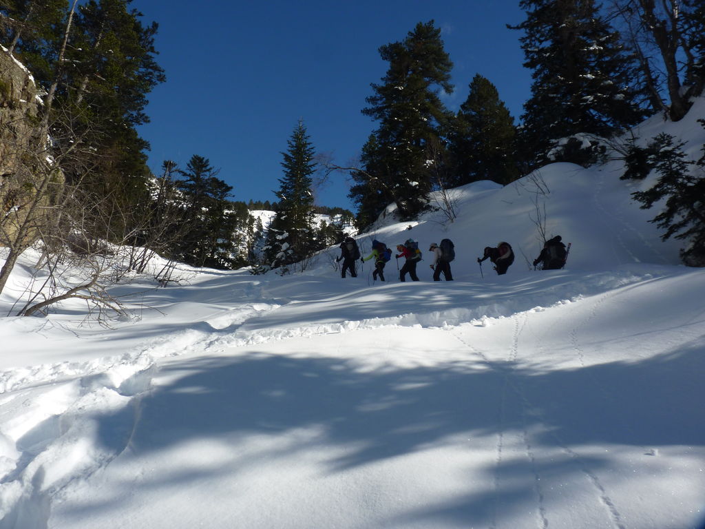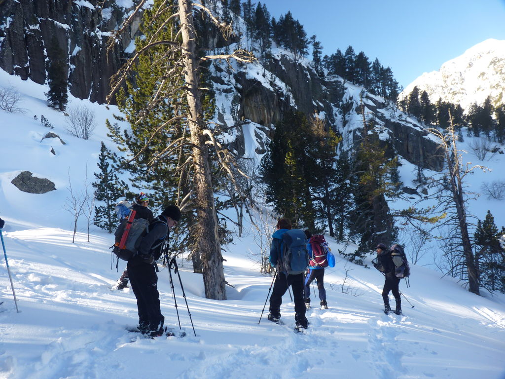 Transfert en Espagne, au sud d’Arties, petit village du Val d’Aran, où nous chaussons les raquettes pour une mise en jambe facile. Nous remontons la vallée de Valardies à travers une magnifique forêt de pins pour accéder au refuge de la Restanca (2010m) où nous passons notre première nuit.