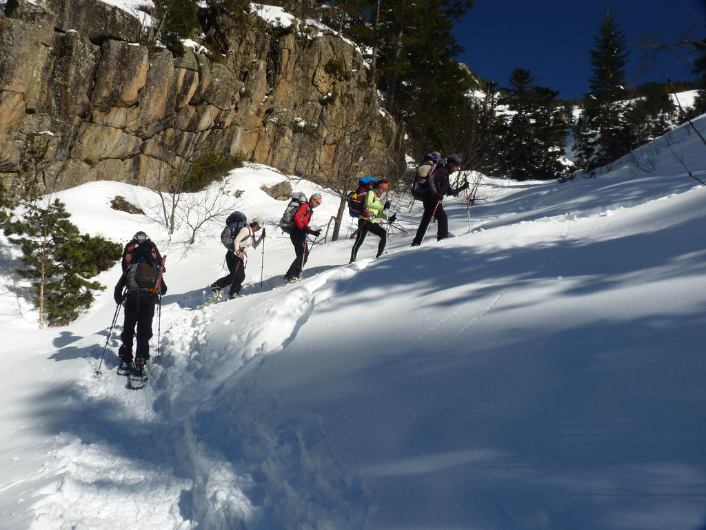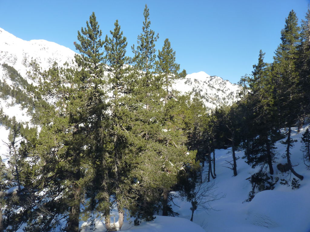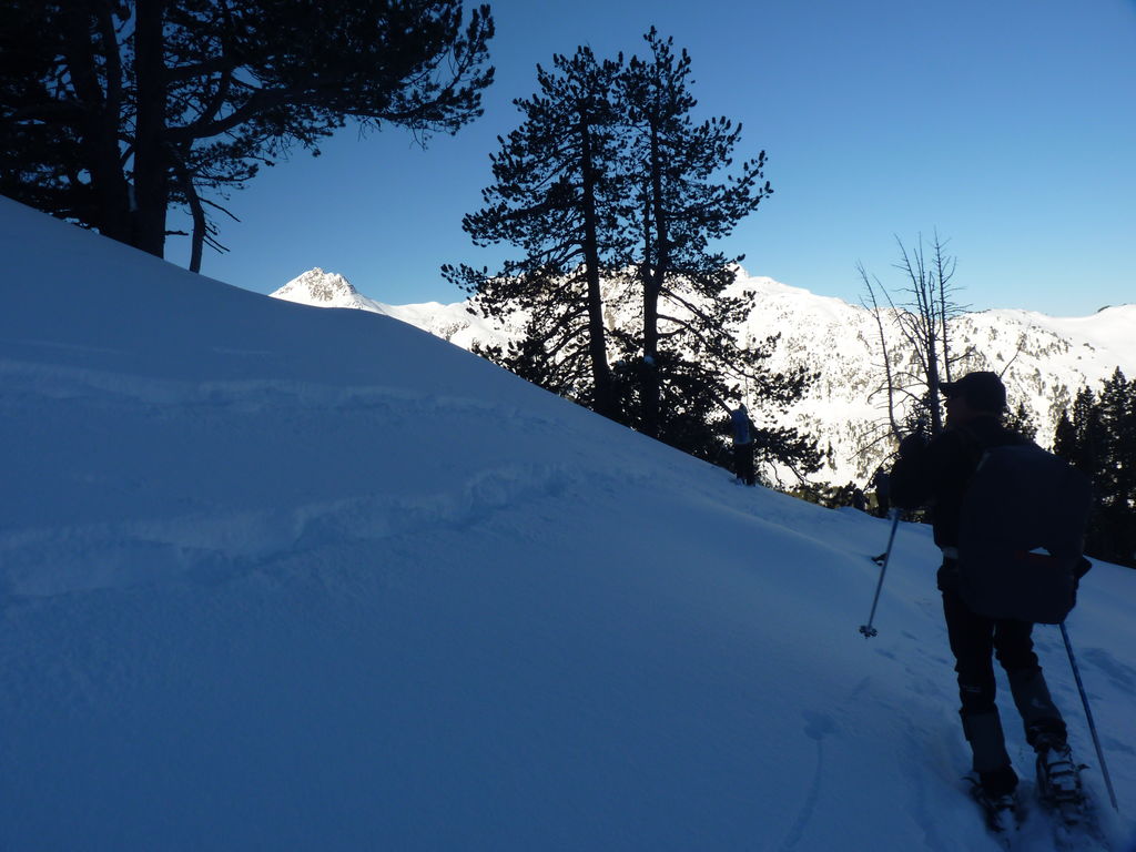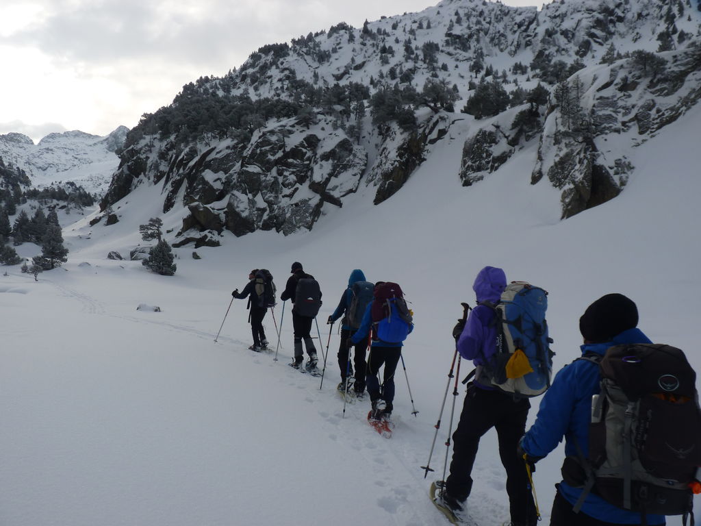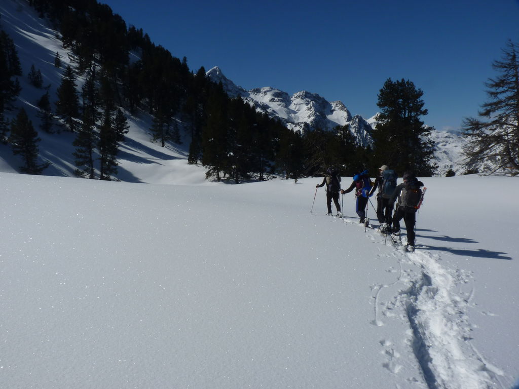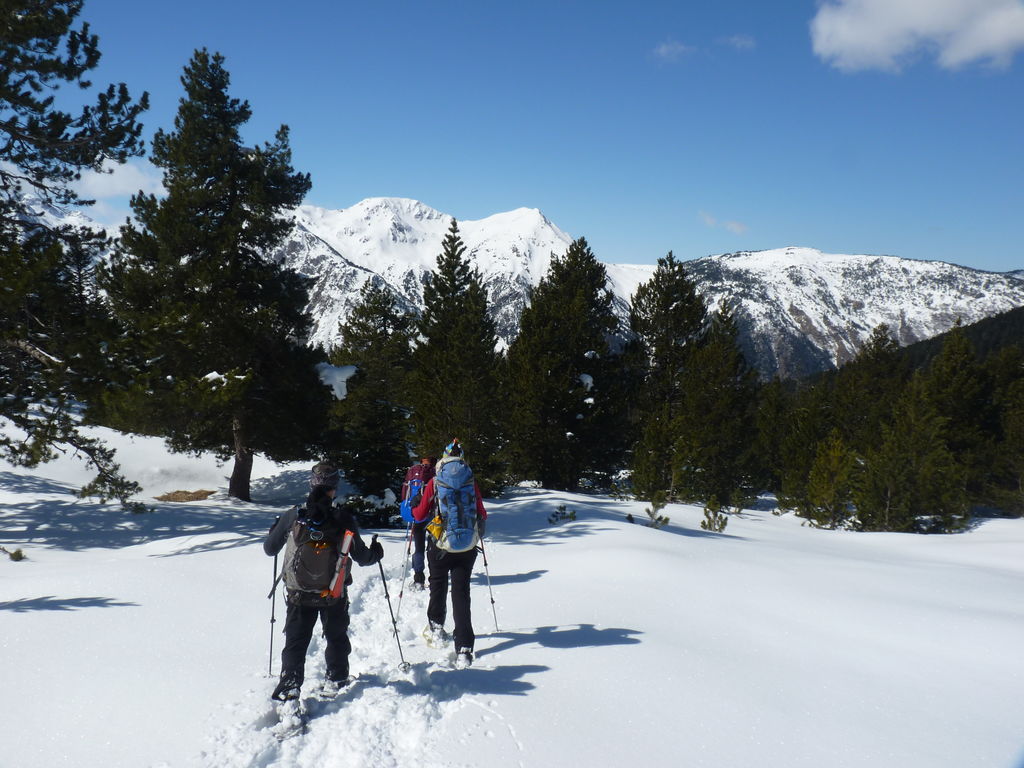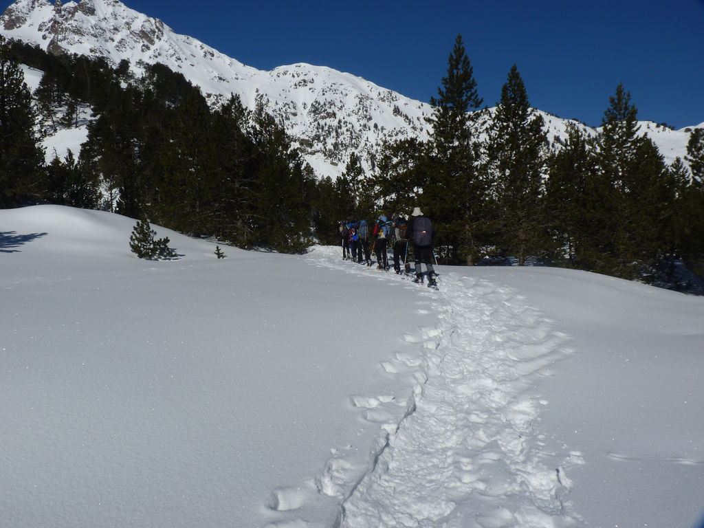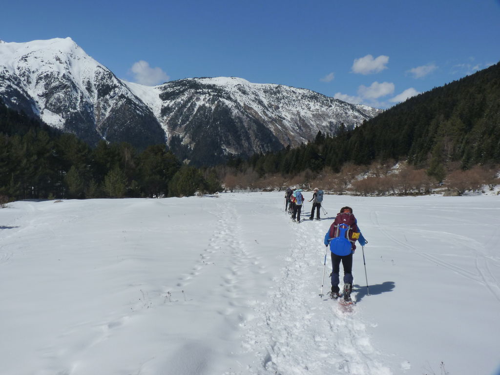 Transfert en Espagne, au sud d’Arties, petit village du Val d’Aran, où nous chaussons les raquettes pour une mise en jambe facile. Nous remontons la vallée de Valardies à travers une magnifique forêt de pins pour accéder au refuge de la Restanca (2010m) où nous passons notre première nuit.