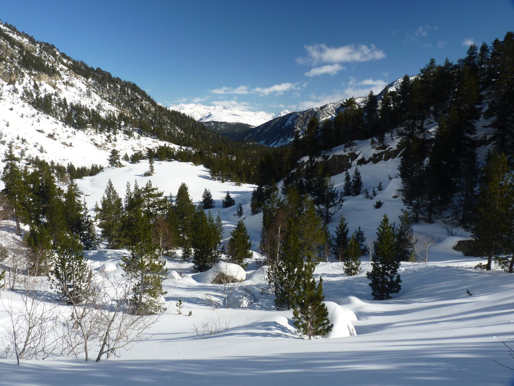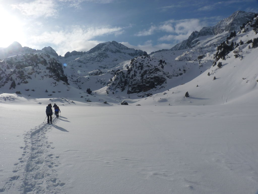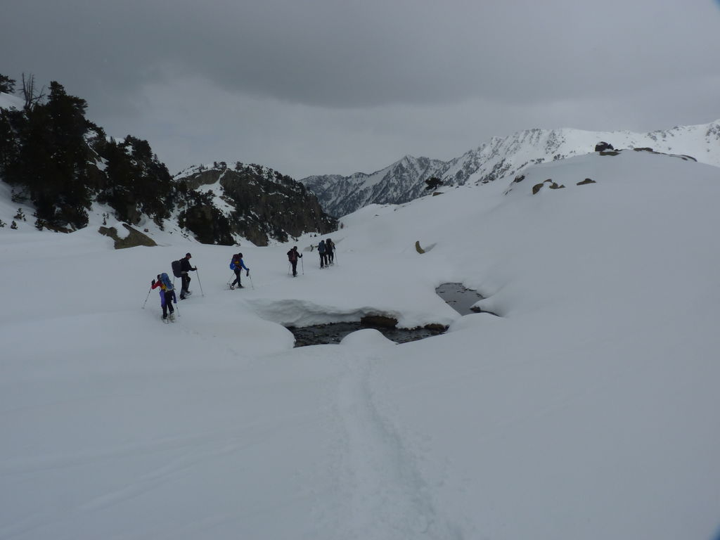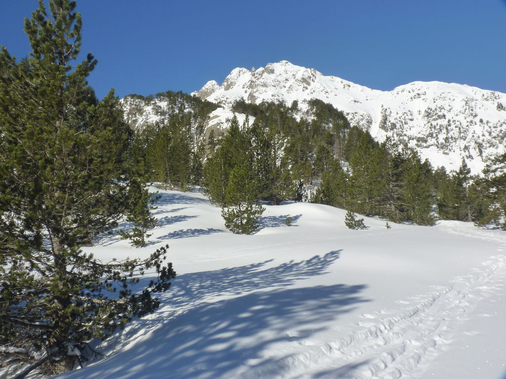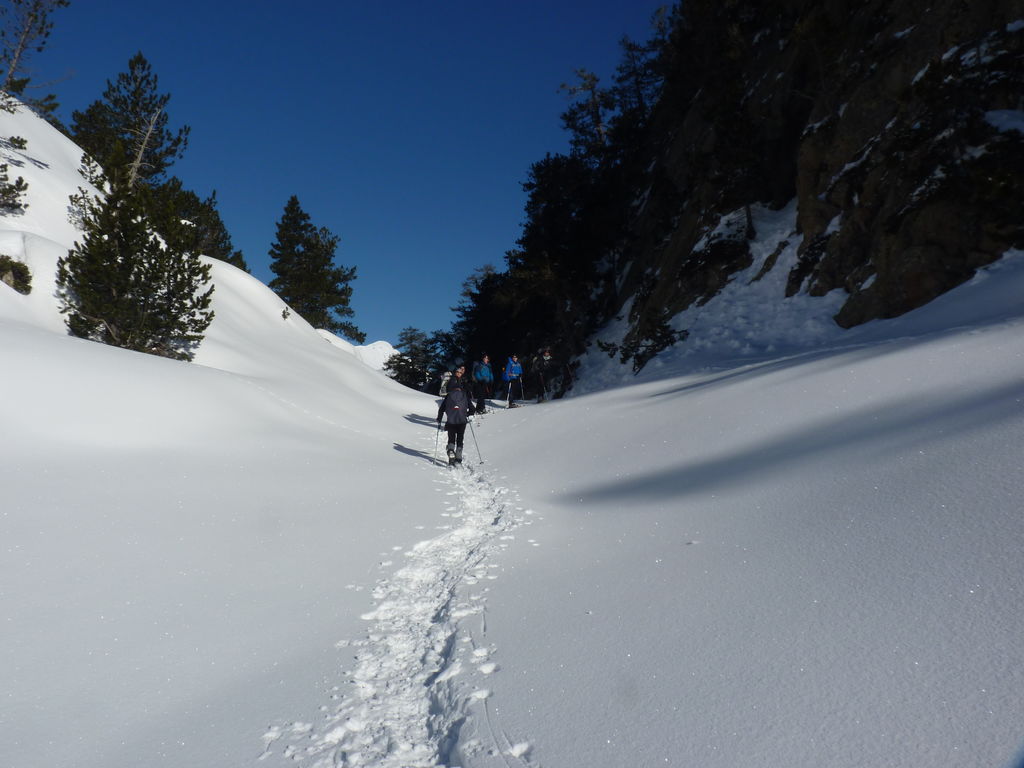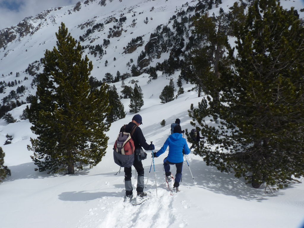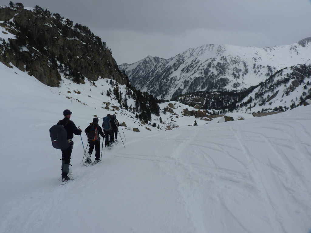 Transfert en Espagne, au sud d’Arties, petit village du Val d’Aran, où nous chaussons les raquettes pour une mise en jambe facile. Nous remontons la vallée de Valardies à travers une magnifique forêt de pins pour accéder au refuge de la Restanca (2010m) où nous passons notre première nuit.