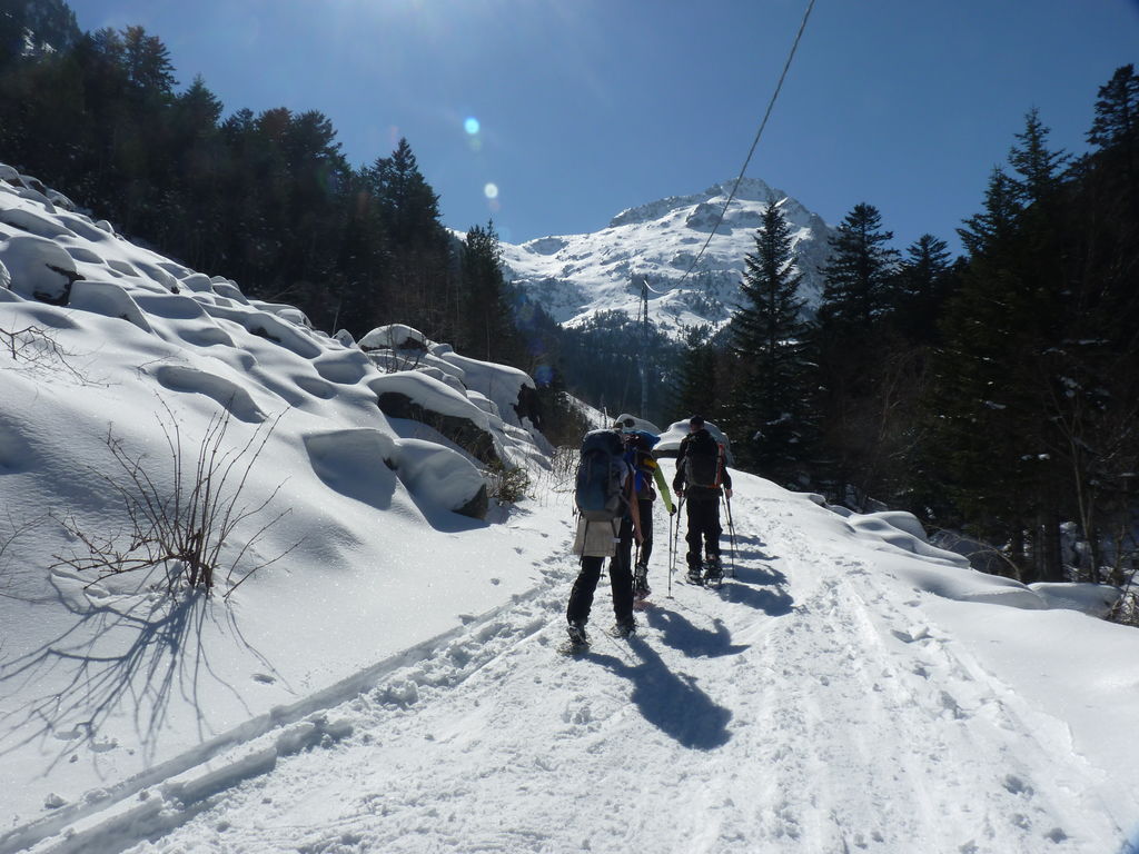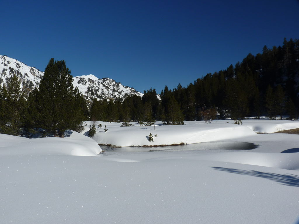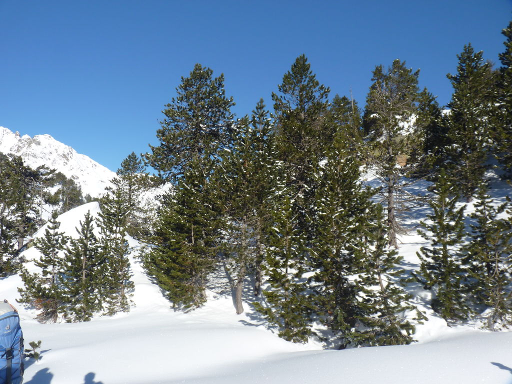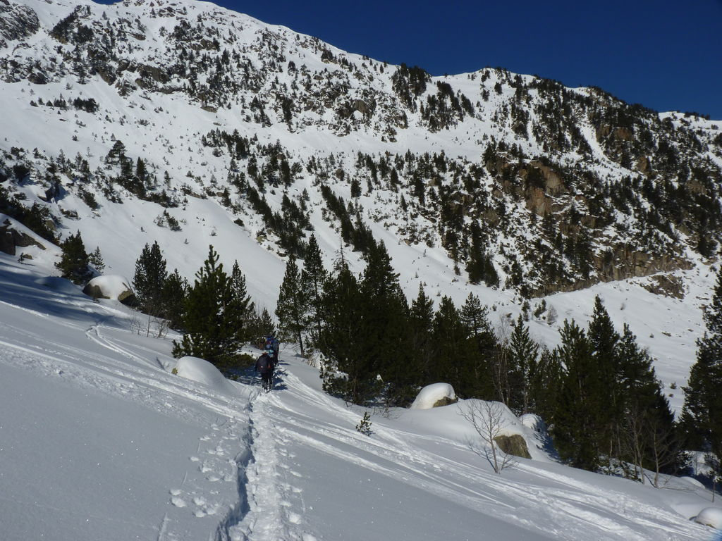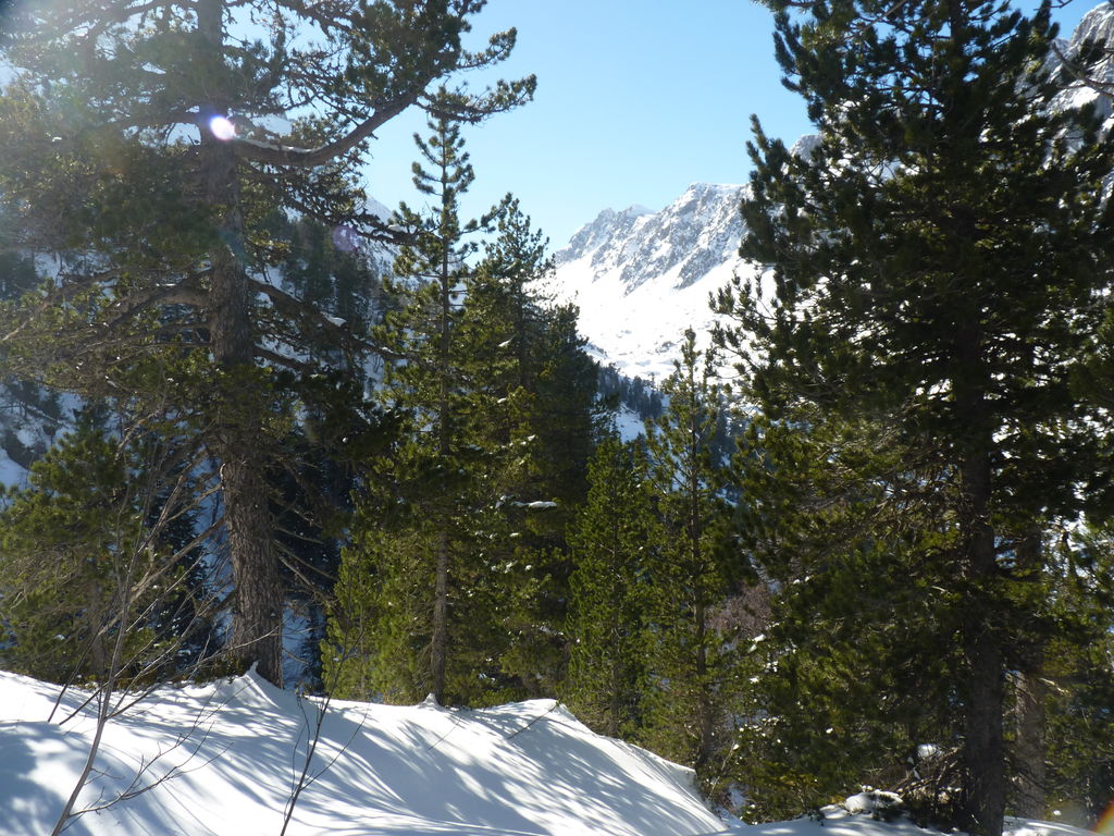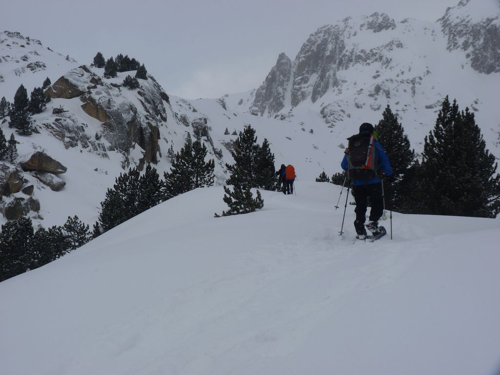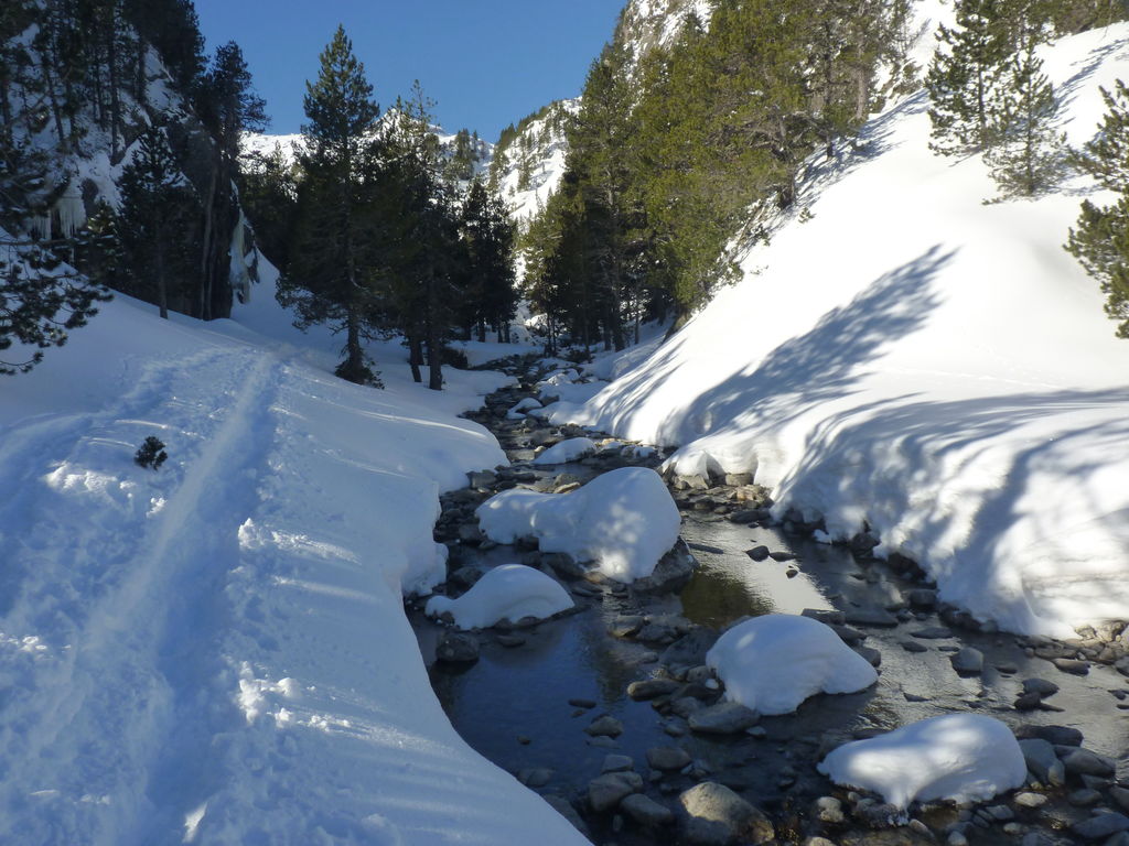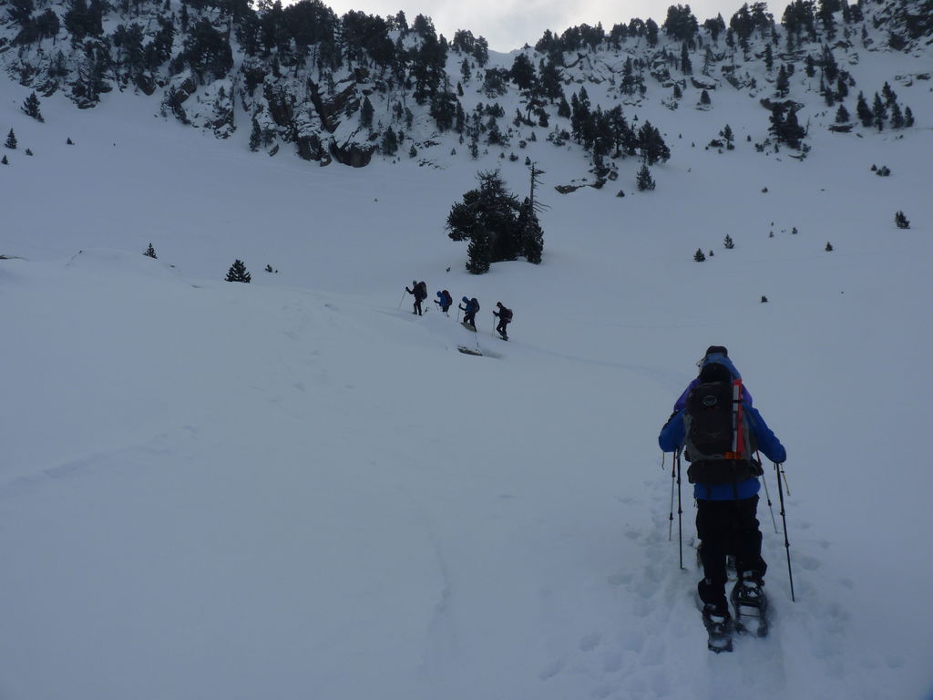 Transfert en Espagne, au sud d’Arties, petit village du Val d’Aran, où nous chaussons les raquettes pour une mise en jambe facile. Nous remontons la vallée de Valardies à travers une magnifique forêt de pins pour accéder au refuge de la Restanca (2010m) où nous passons notre première nuit.
