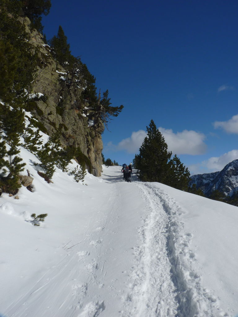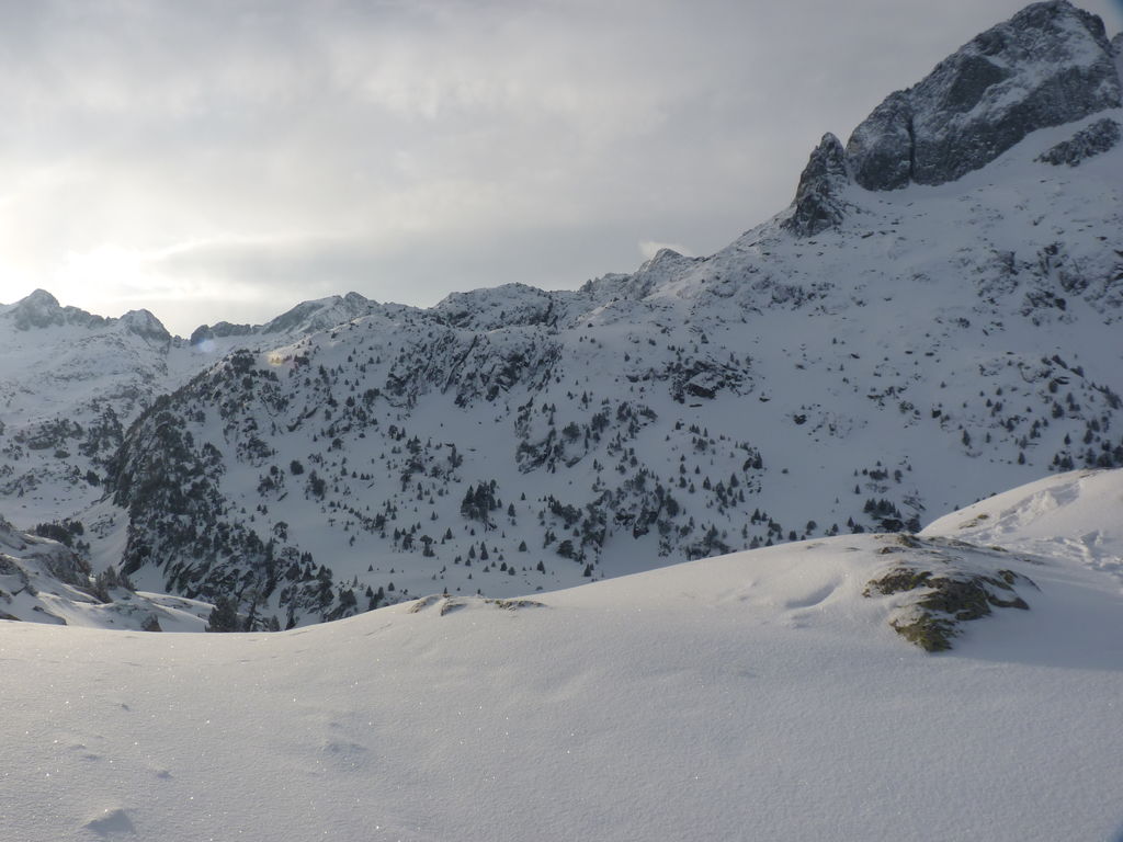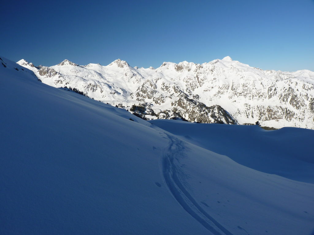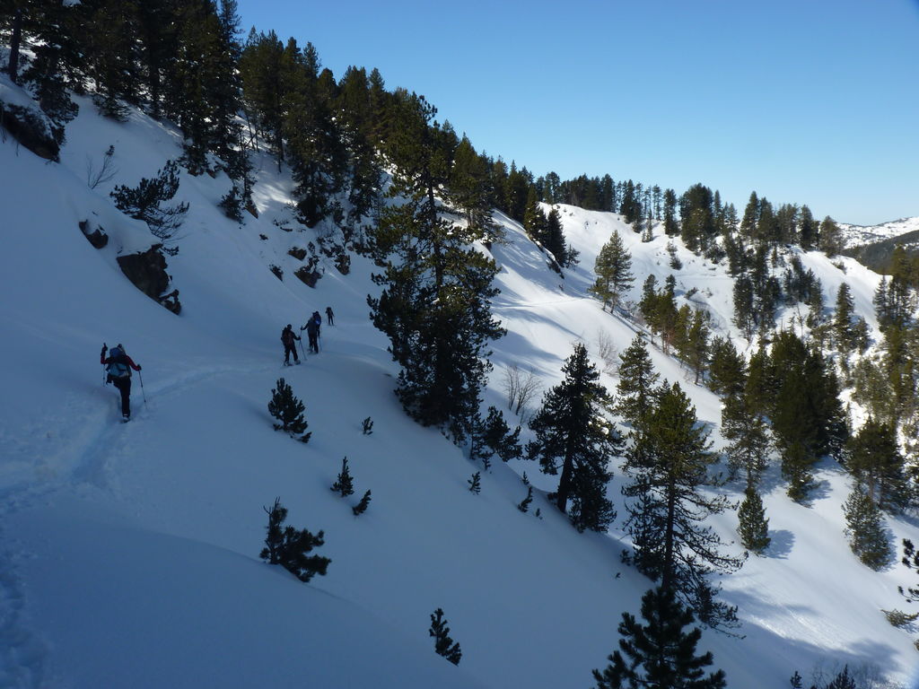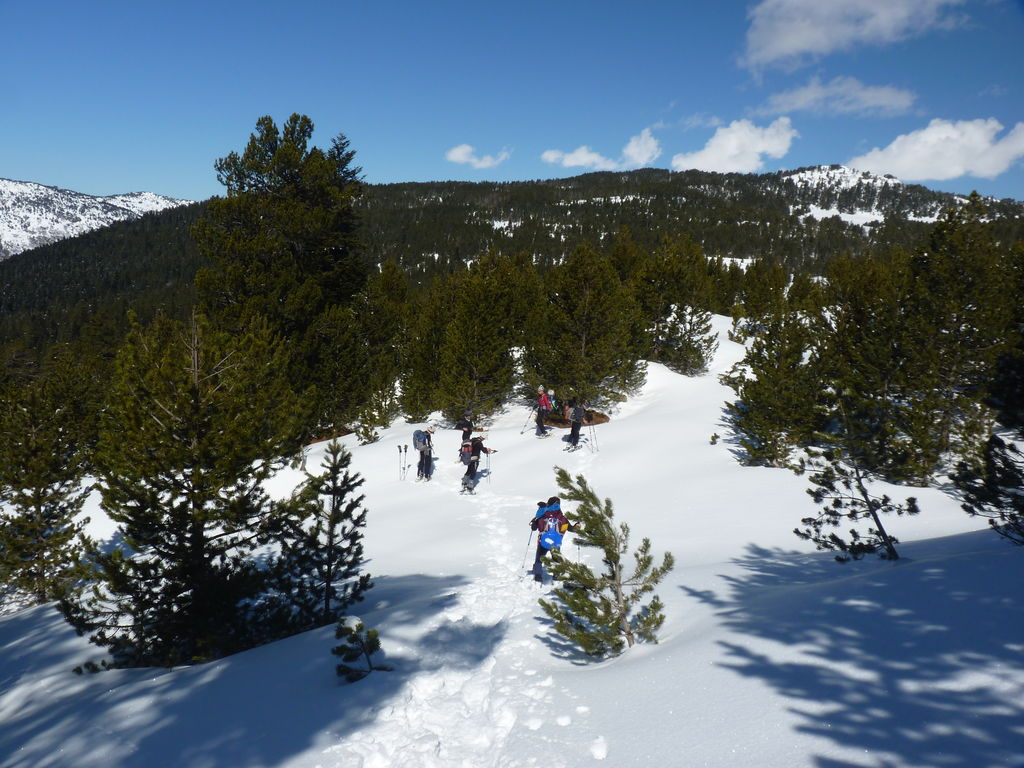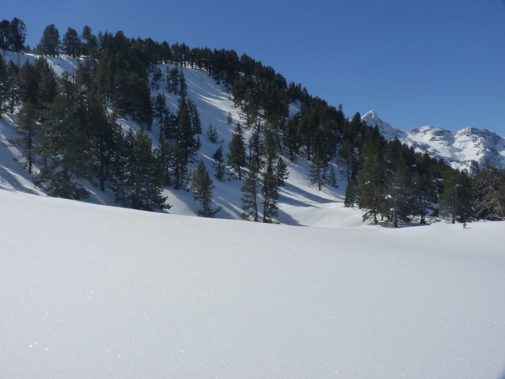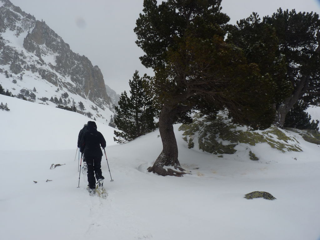 Transfert en Espagne, au sud d’Arties, petit village du Val d’Aran, où nous chaussons les raquettes pour une mise en jambe facile. Nous remontons la vallée de Valardies à travers une magnifique forêt de pins pour accéder au refuge de la Restanca (2010m) où nous passons notre première nuit.