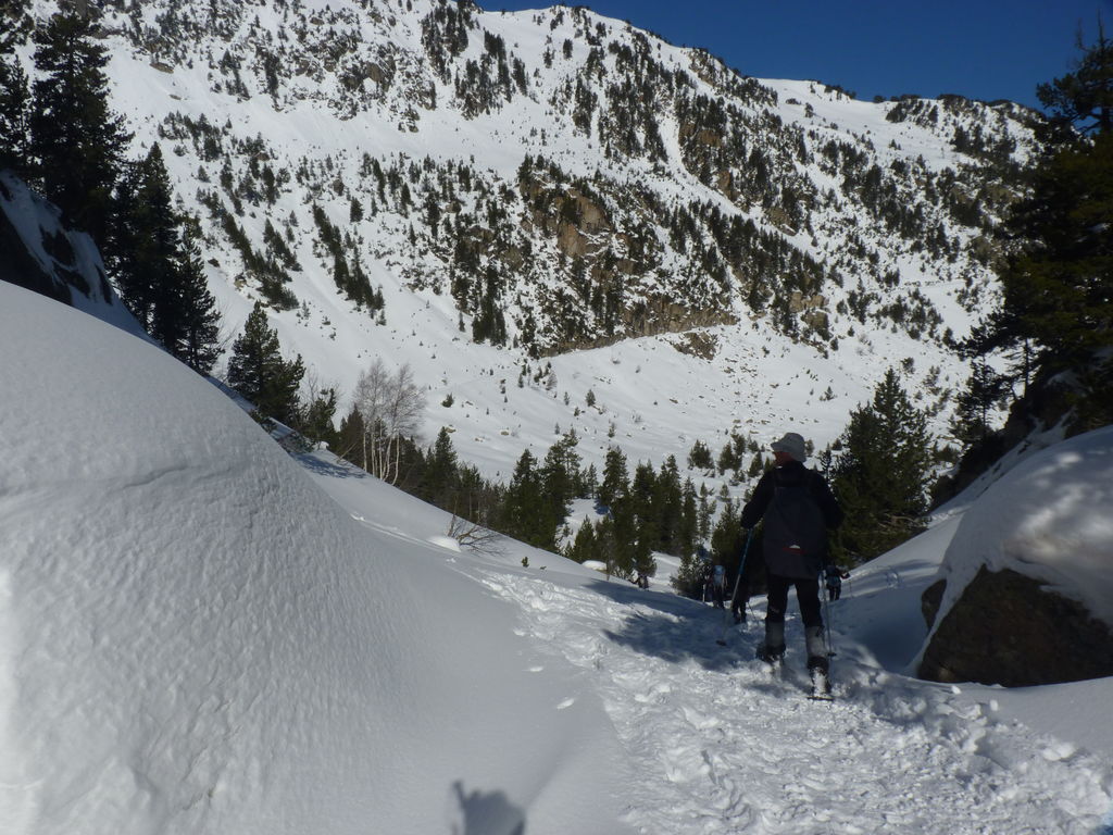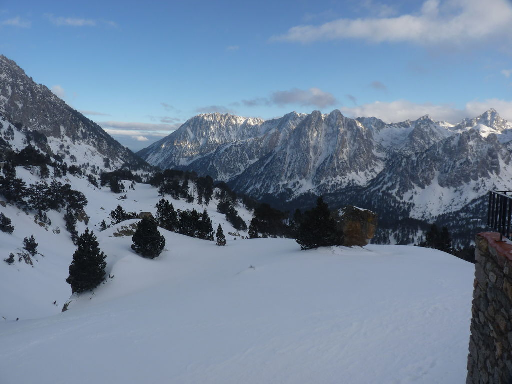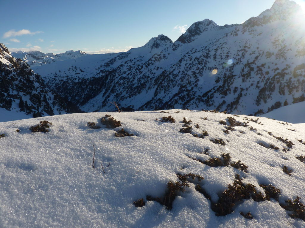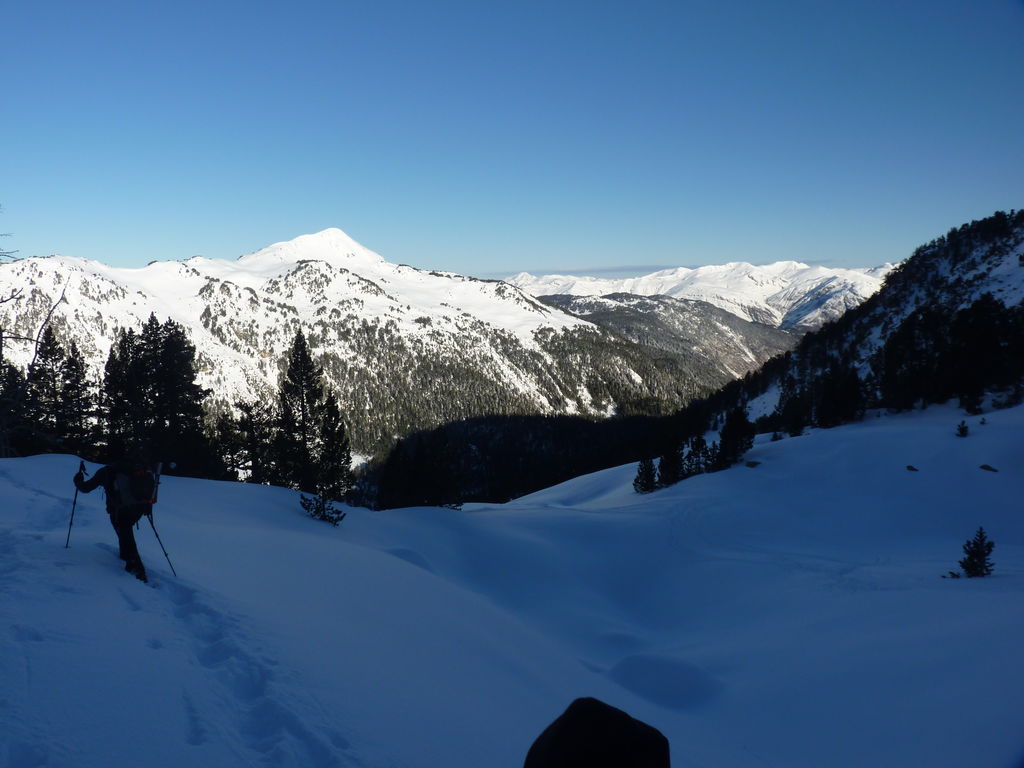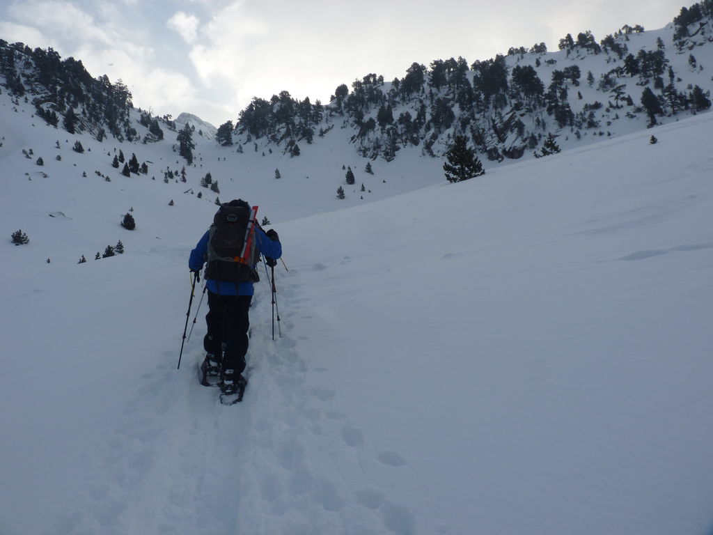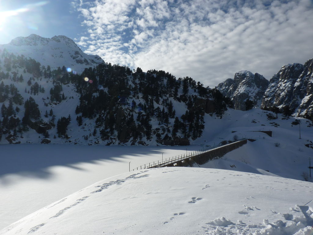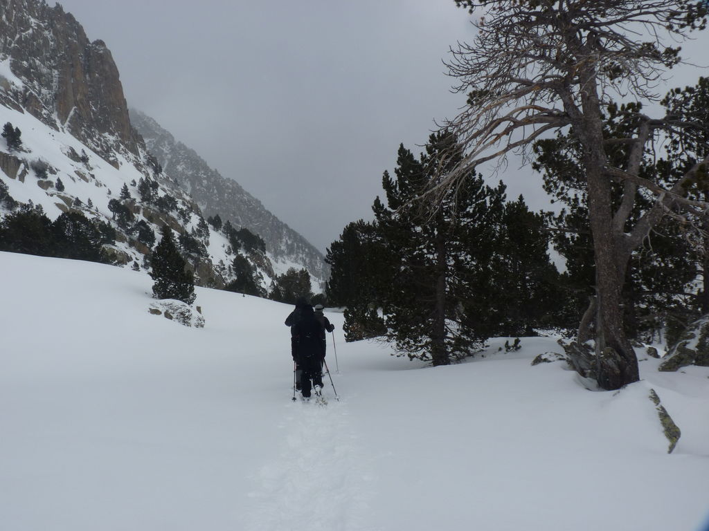 Transfert en Espagne, au sud d’Arties, petit village du Val d’Aran, où nous chaussons les raquettes pour une mise en jambe facile. Nous remontons la vallée de Valardies à travers une magnifique forêt de pins pour accéder au refuge de la Restanca (2010m) où nous passons notre première nuit.