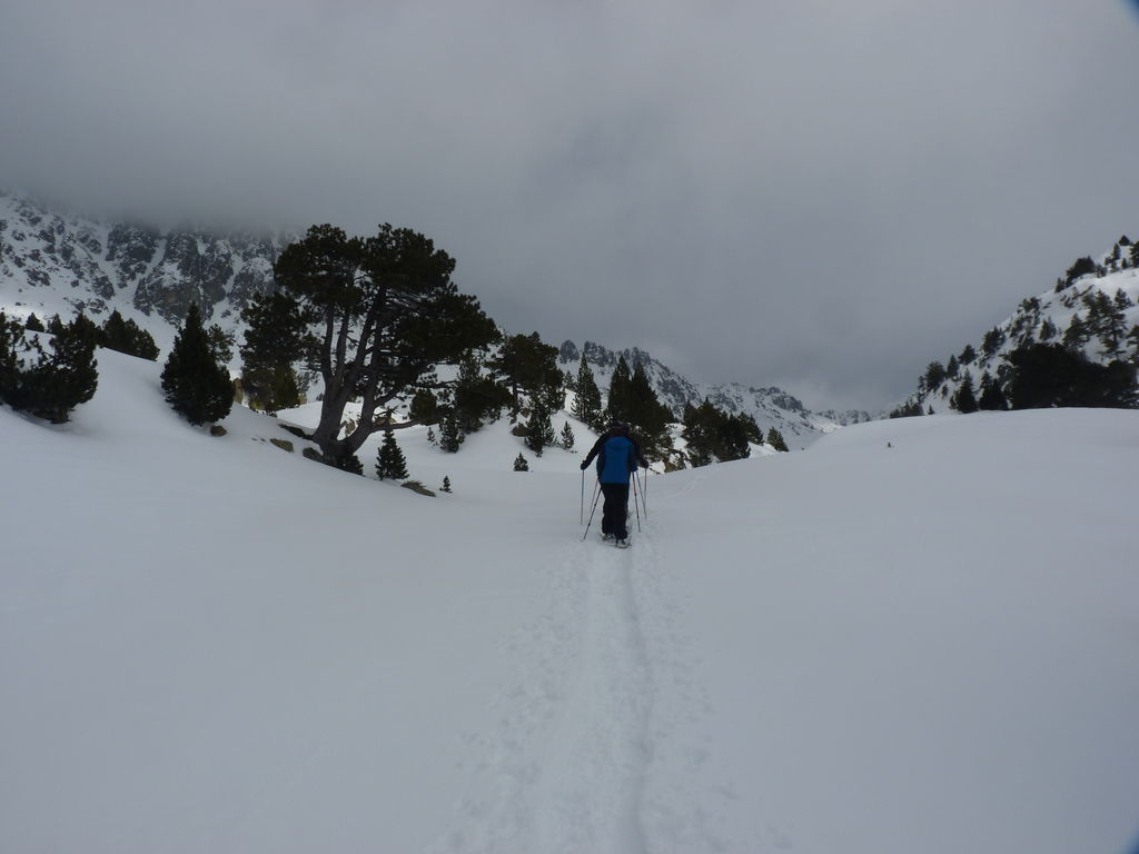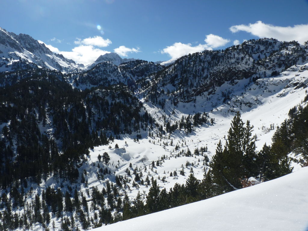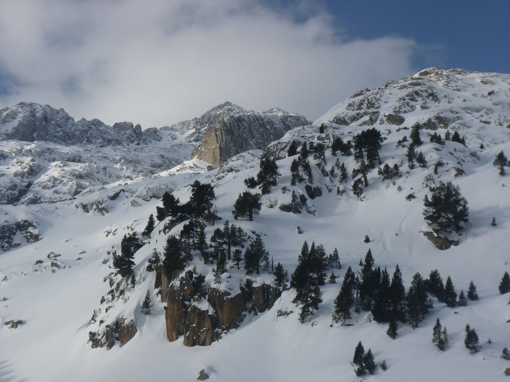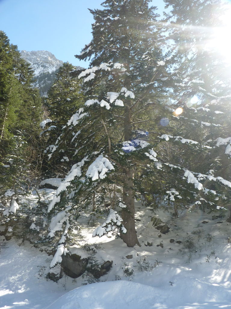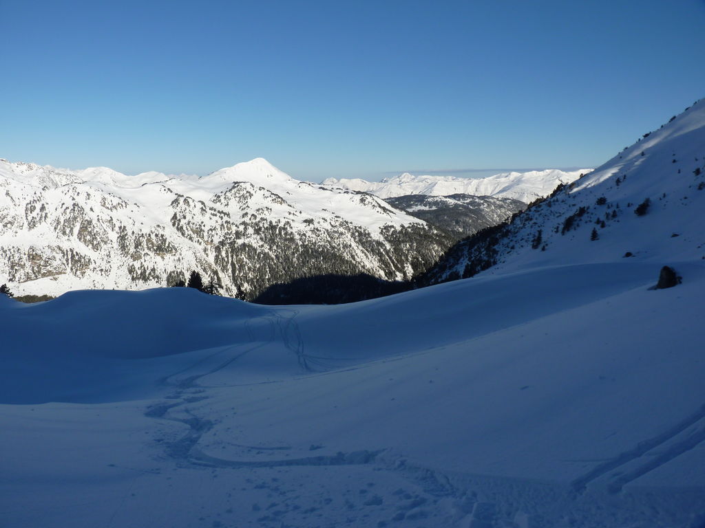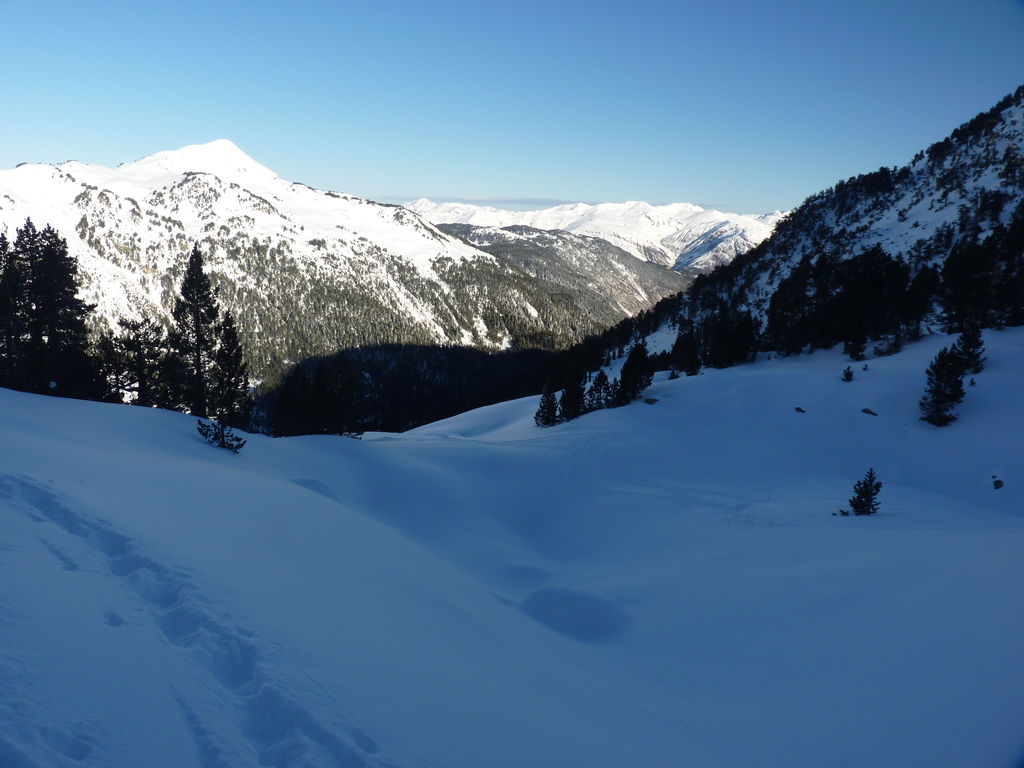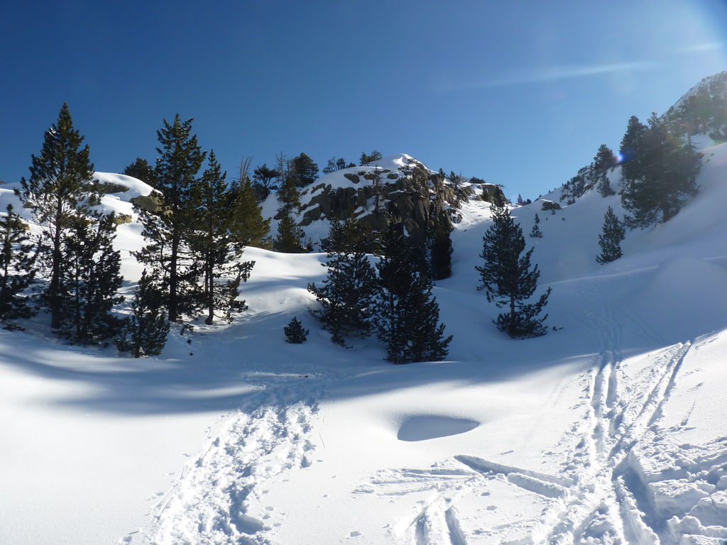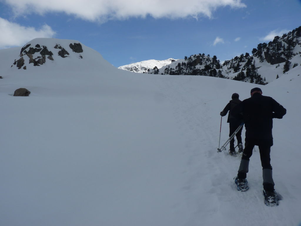 Transfert en Espagne, au sud d’Arties, petit village du Val d’Aran, où nous chaussons les raquettes pour une mise en jambe facile. Nous remontons la vallée de Valardies à travers une magnifique forêt de pins pour accéder au refuge de la Restanca (2010m) où nous passons notre première nuit.
