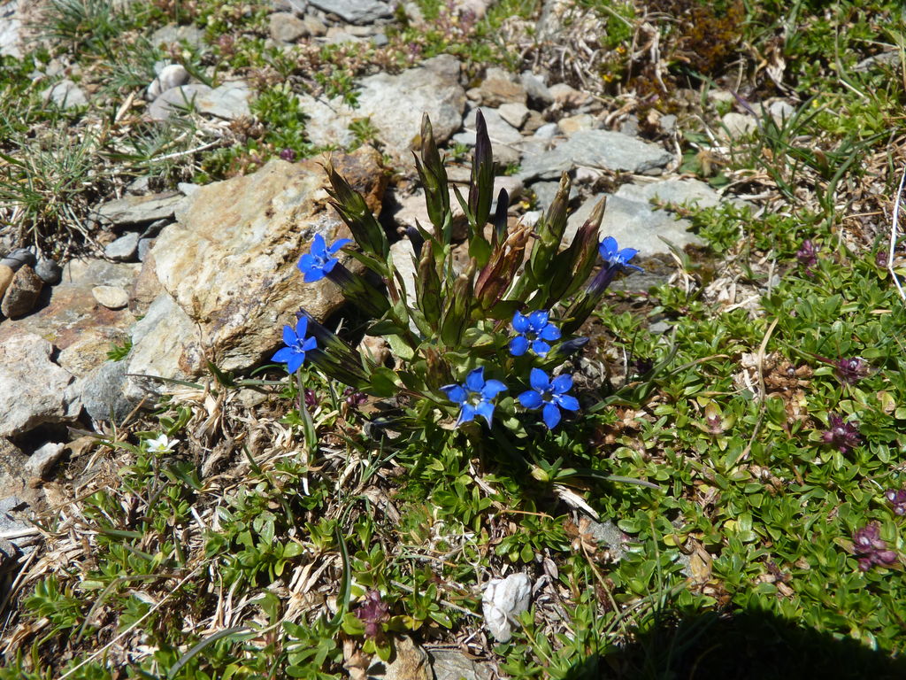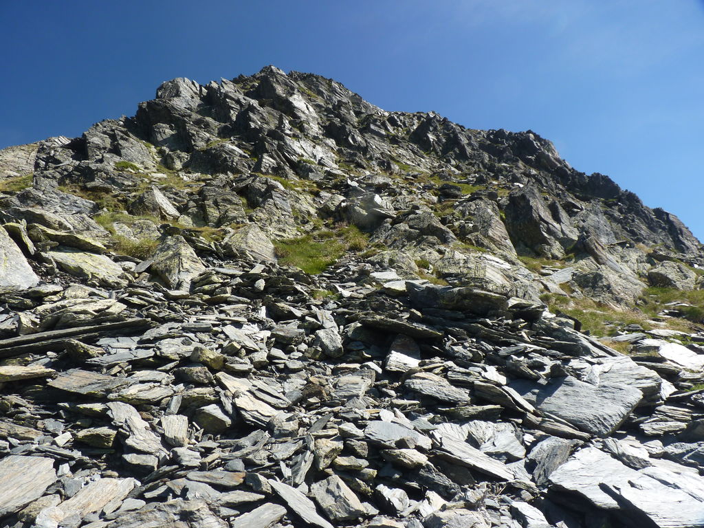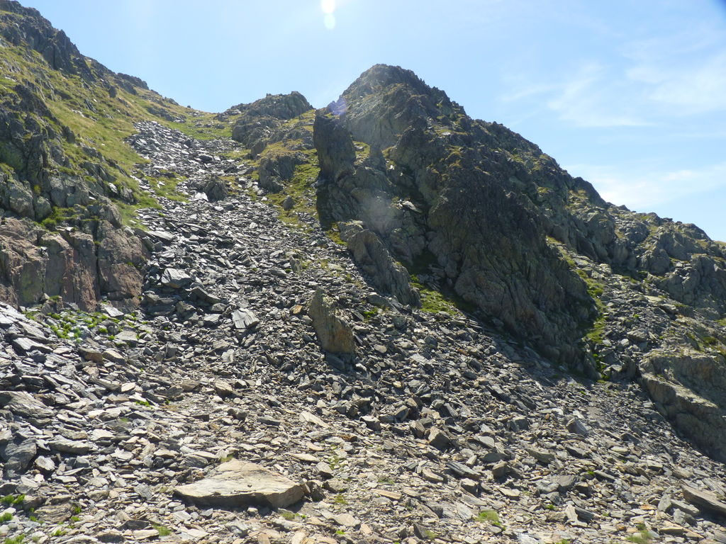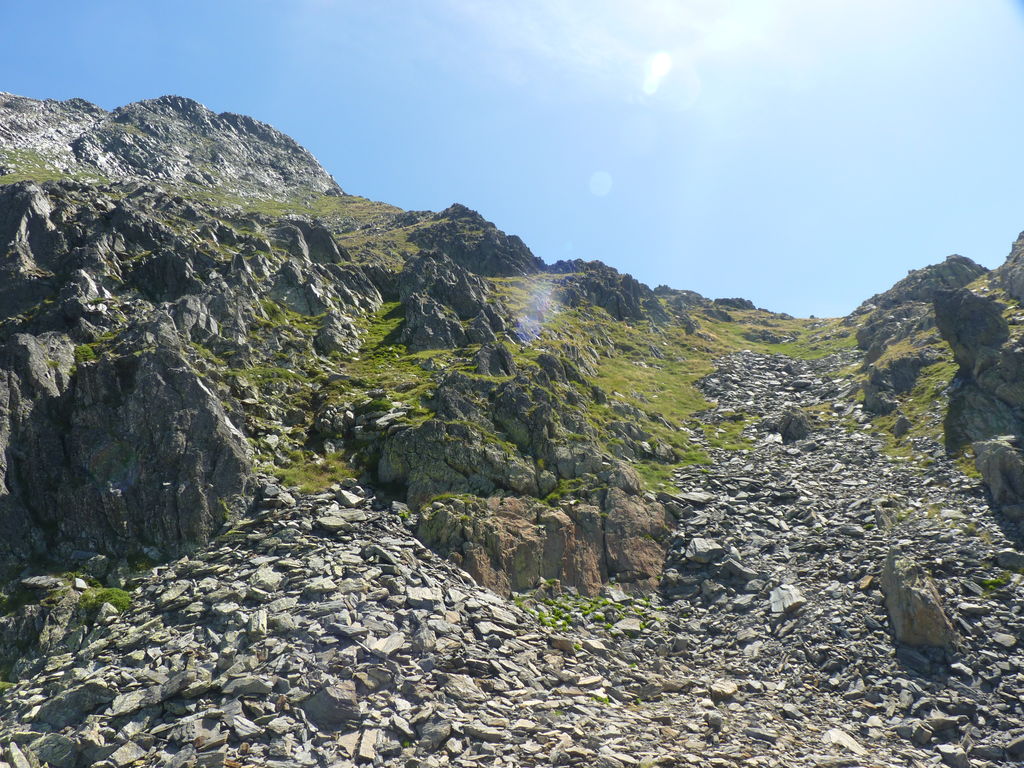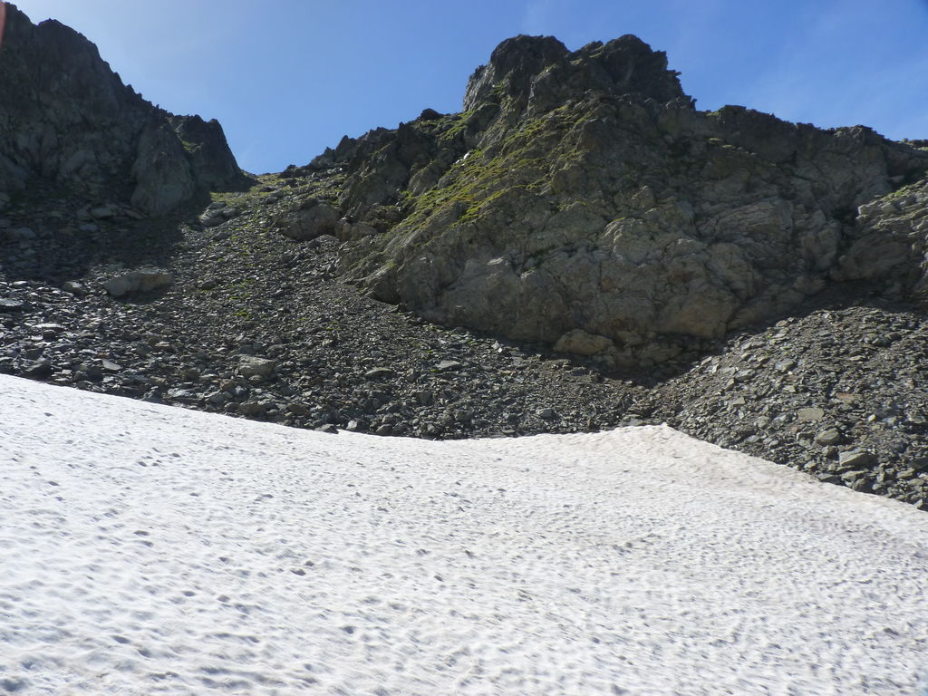 Vers 2400m d’altitude le paysage devient plus minéral et est dominé par les schistes noirs et rouges (suivant leur teneur en fer). Après un névé et un dernier lac l’ascension devient plus raide et nous devons attacher nos bâtons de marche à nos sacs à dos pour terminer la montée.