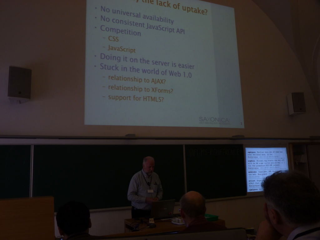 That doesn’t seem to bother that much the XML Prague attendees who are markup language addicts anyway: if the « mass of web developers » do not care about XML that’s their problem. The benefits of using XML is well known and that just means that we have to develop the XML tools we need on the server as well as on the browser.