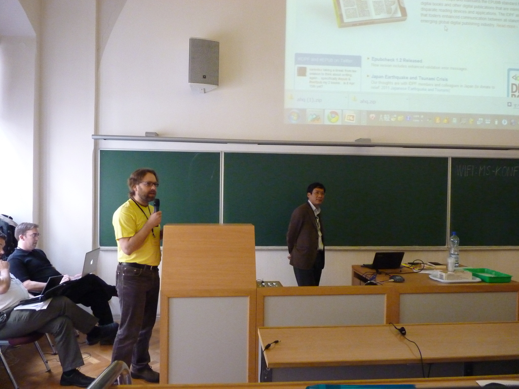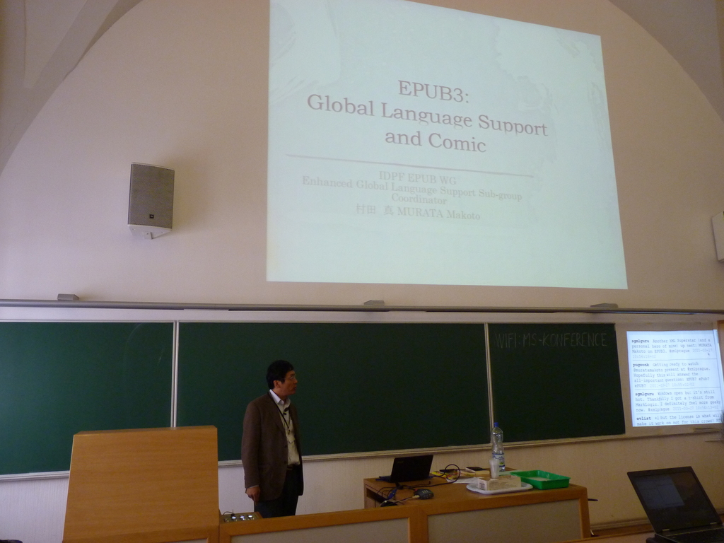 MURATA Makoto (EPUB3: Global Language and Comic)Aside from all the technical food for thought, an image of the conference that I won’t forget is Murata Makoto expressing his grief for the victims of the earthquake in Japan with simple and sober terms.