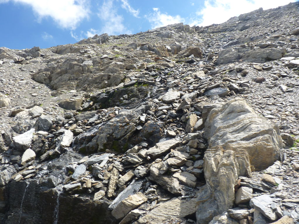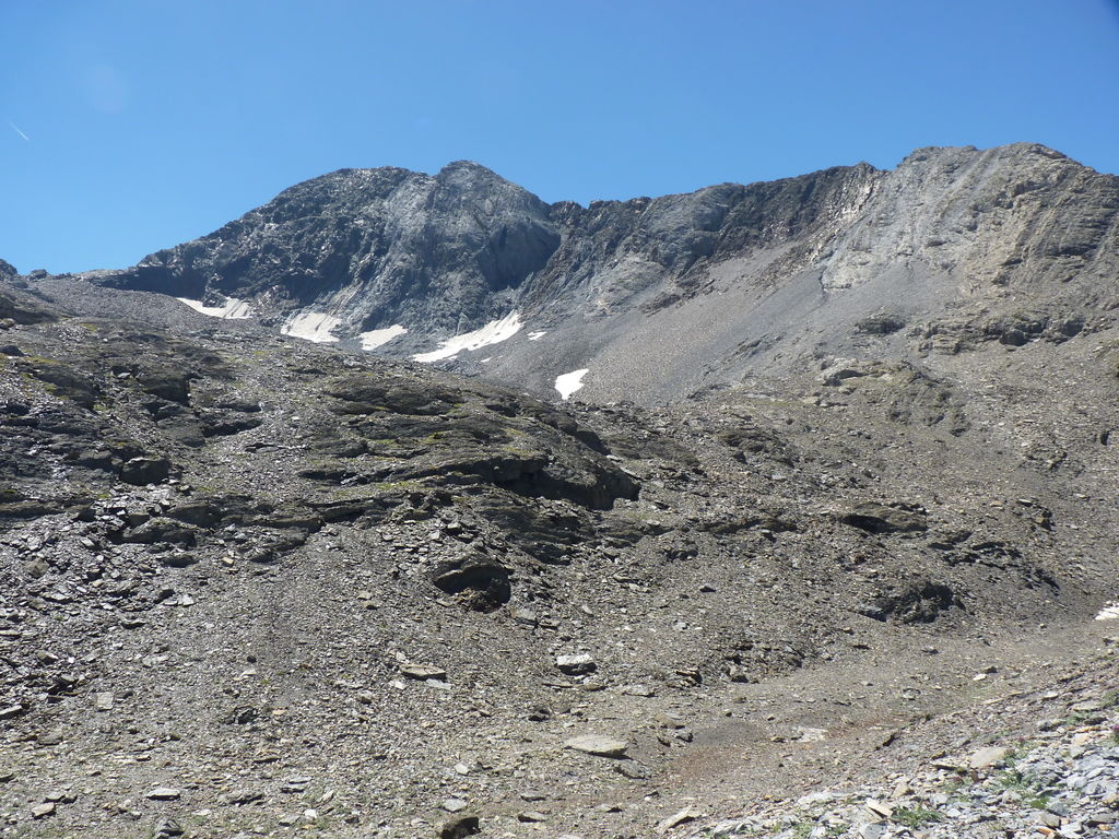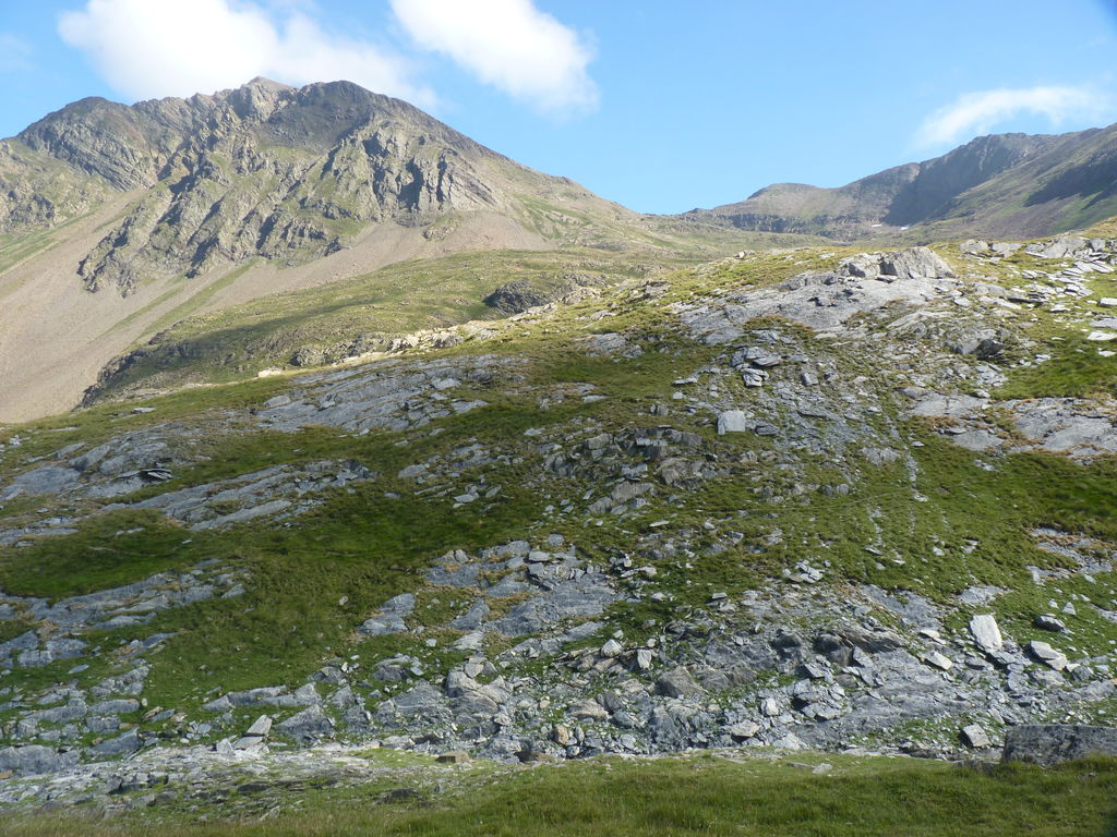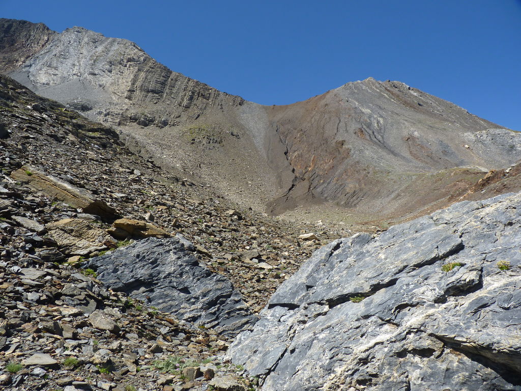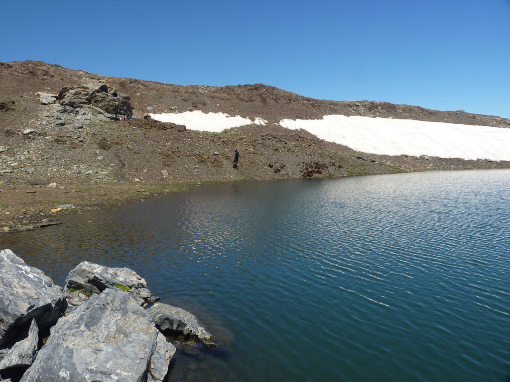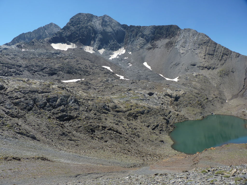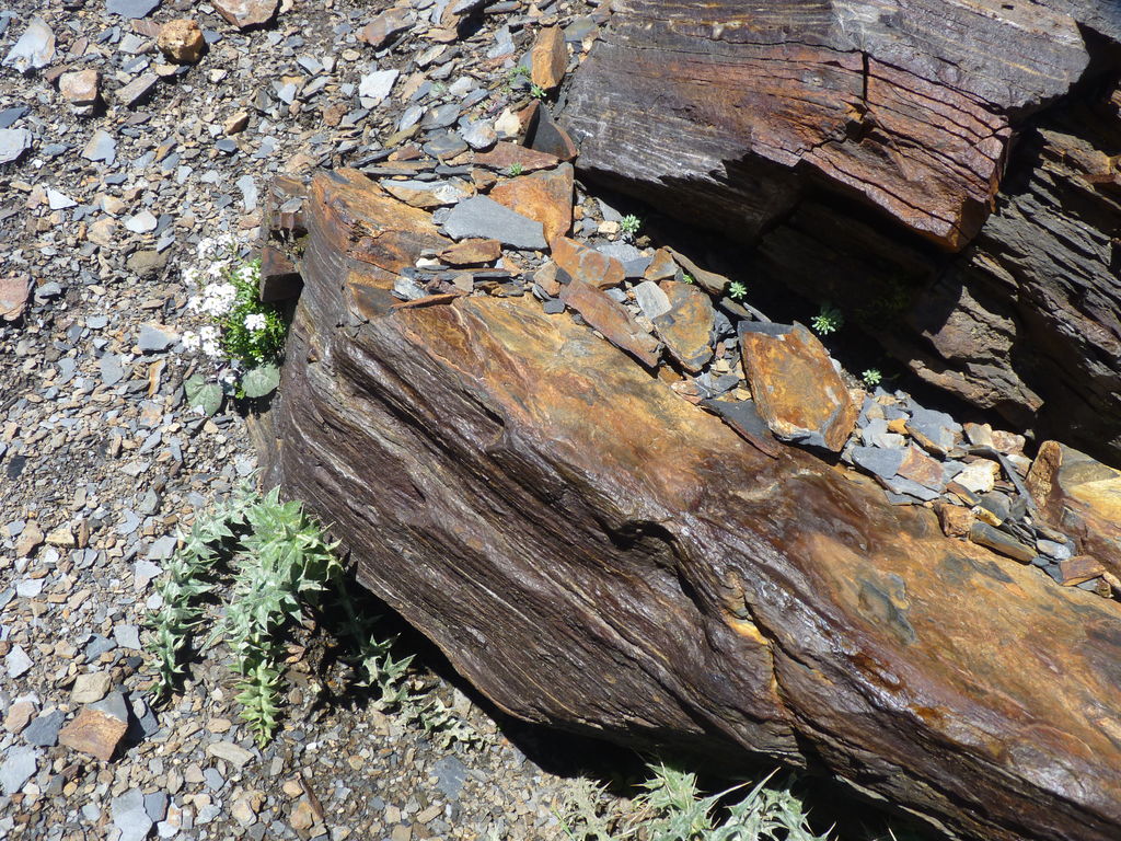 Vers 2400m d’altitude le paysage devient plus minéral et est dominé par les schistes noirs et rouges (suivant leur teneur en fer). Après un névé et un dernier lac l’ascension devient plus raide et nous devons attacher nos bâtons de marche à nos sacs à dos pour terminer la montée.