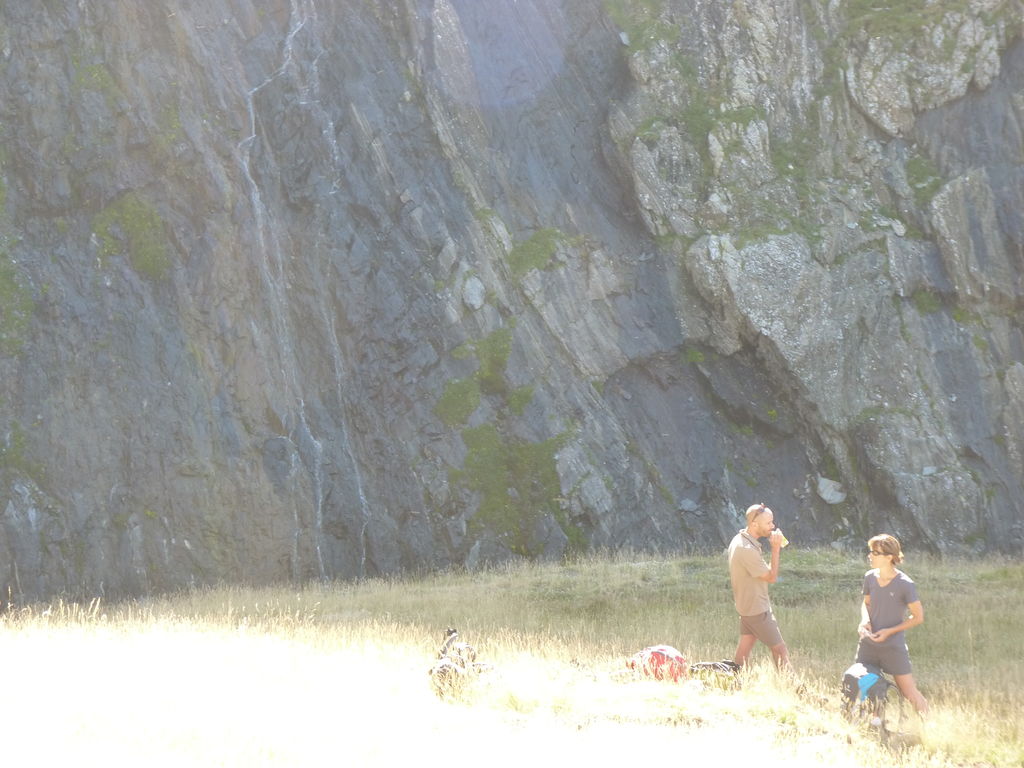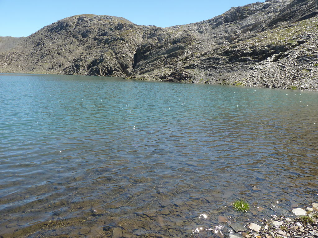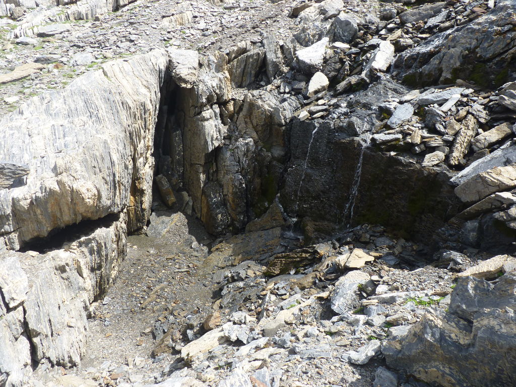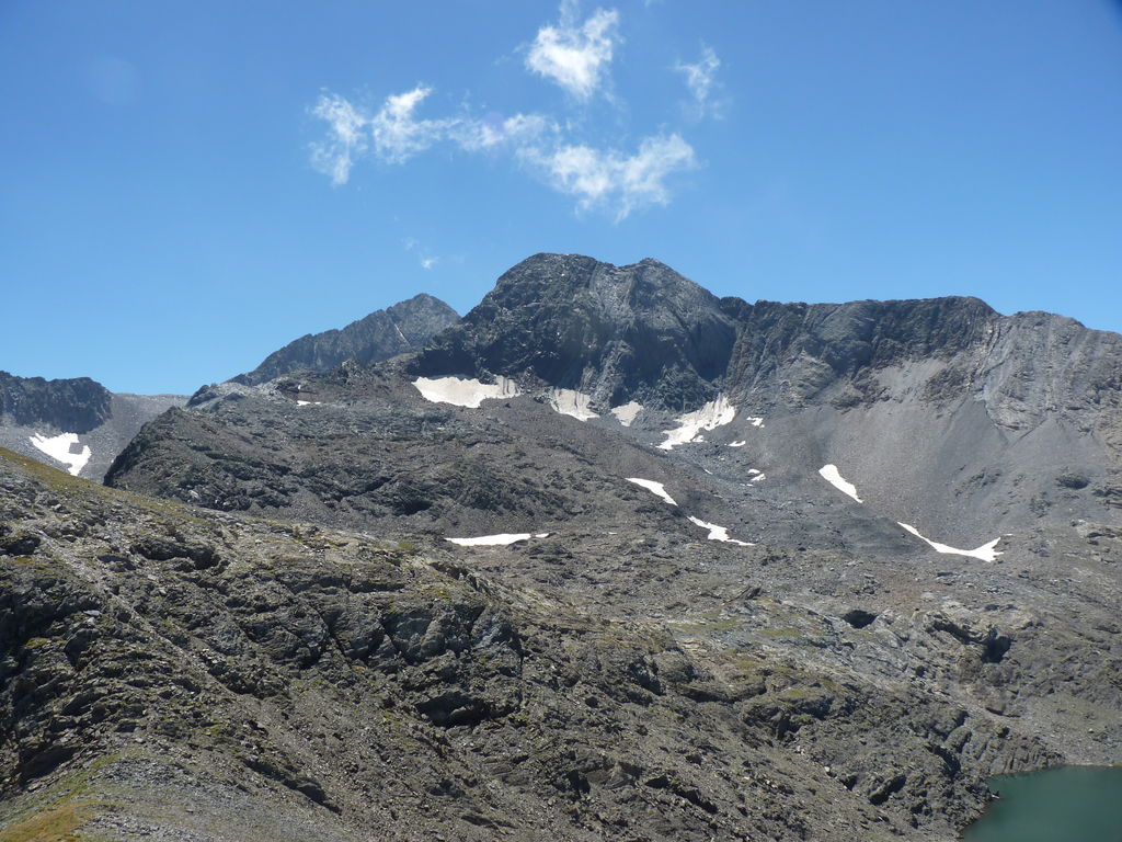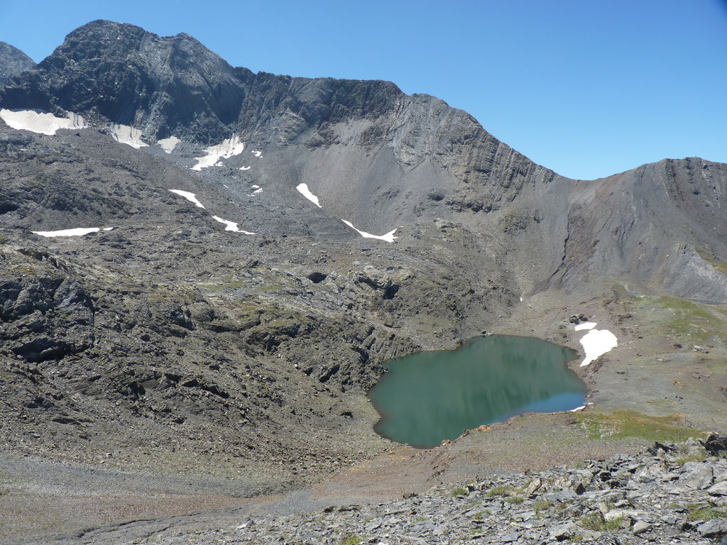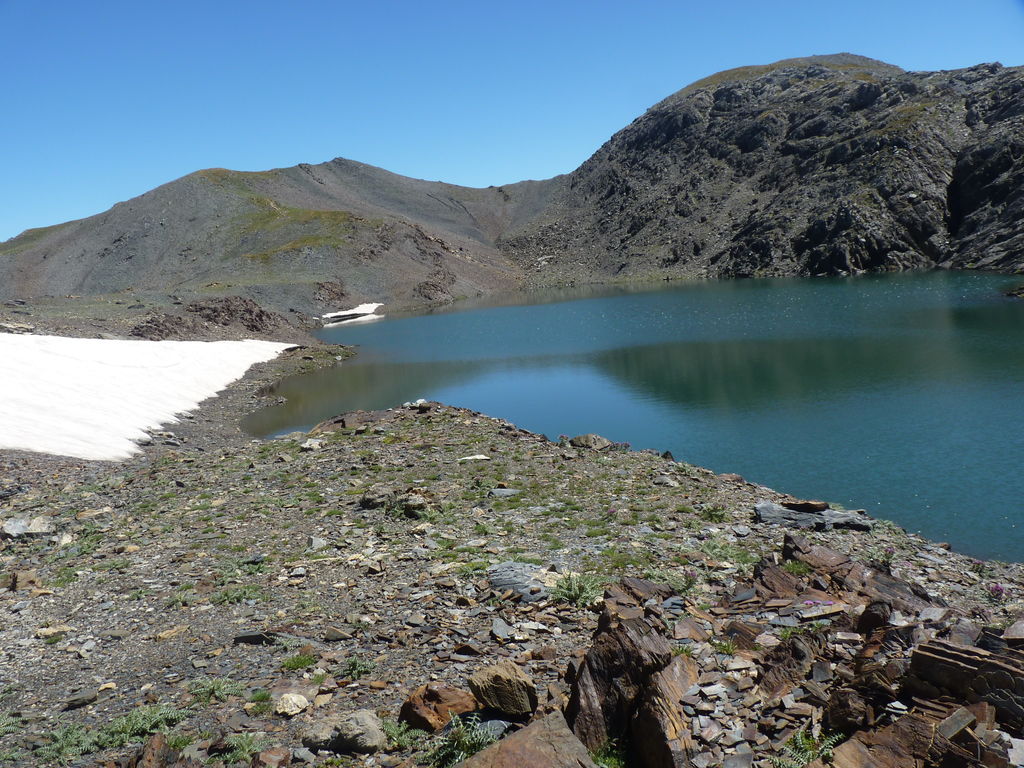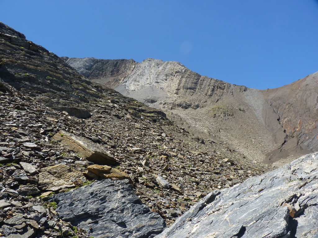 Vers 2400m d’altitude le paysage devient plus minéral et est dominé par les schistes noirs et rouges (suivant leur teneur en fer). Après un névé et un dernier lac l’ascension devient plus raide et nous devons attacher nos bâtons de marche à nos sacs à dos pour terminer la montée.