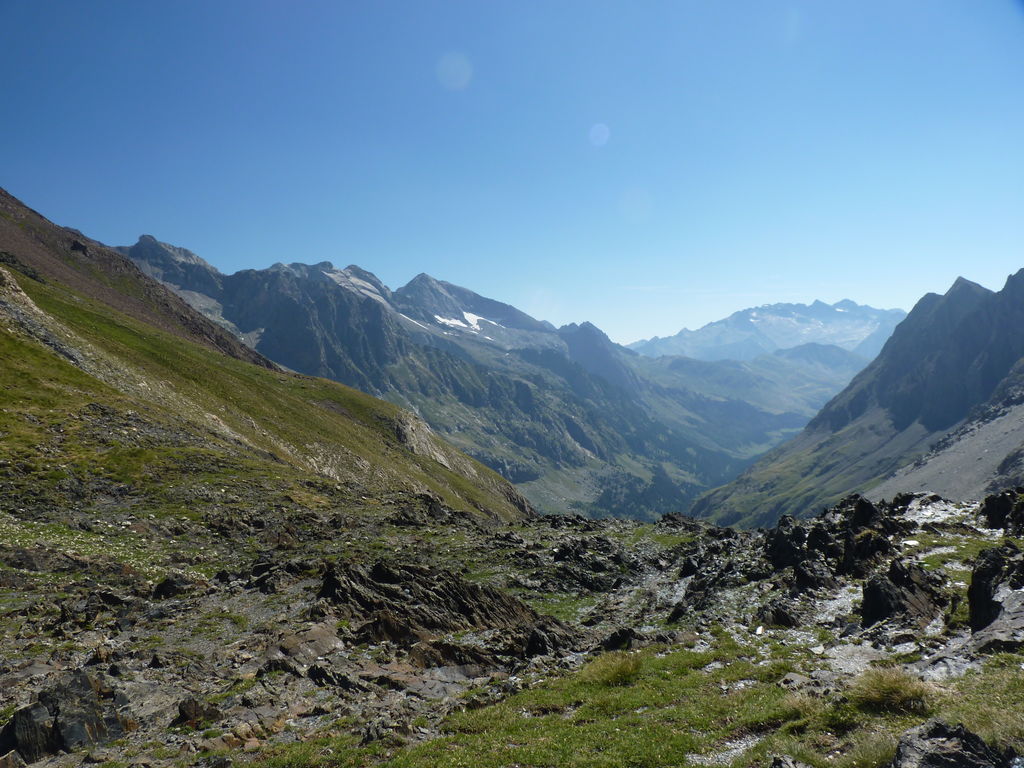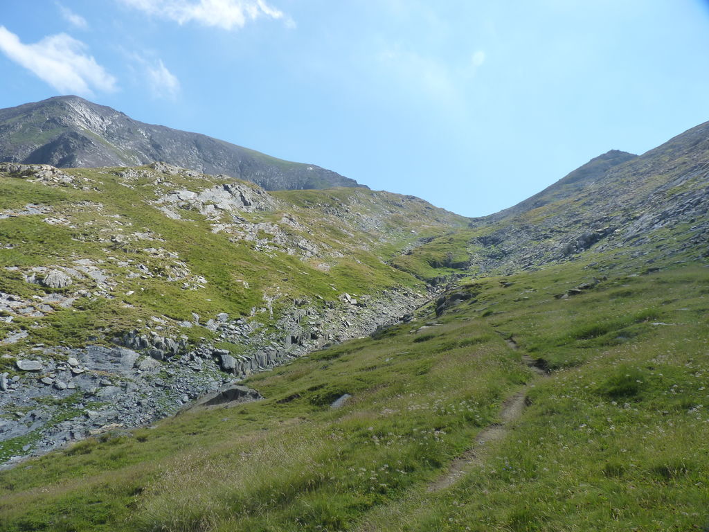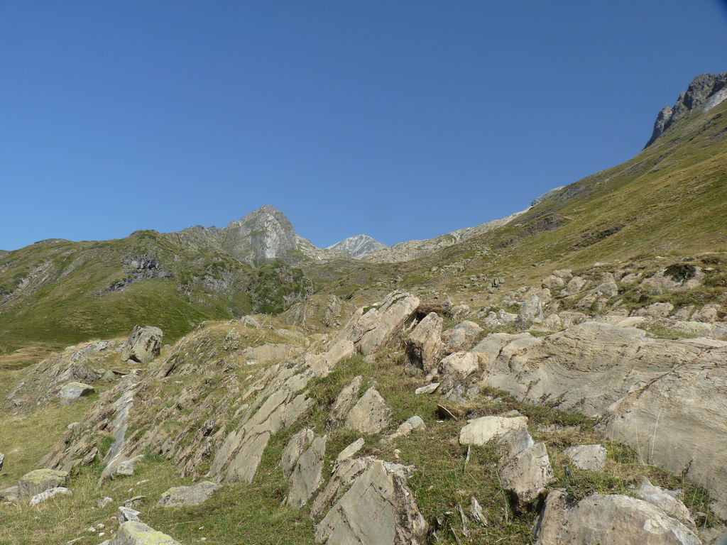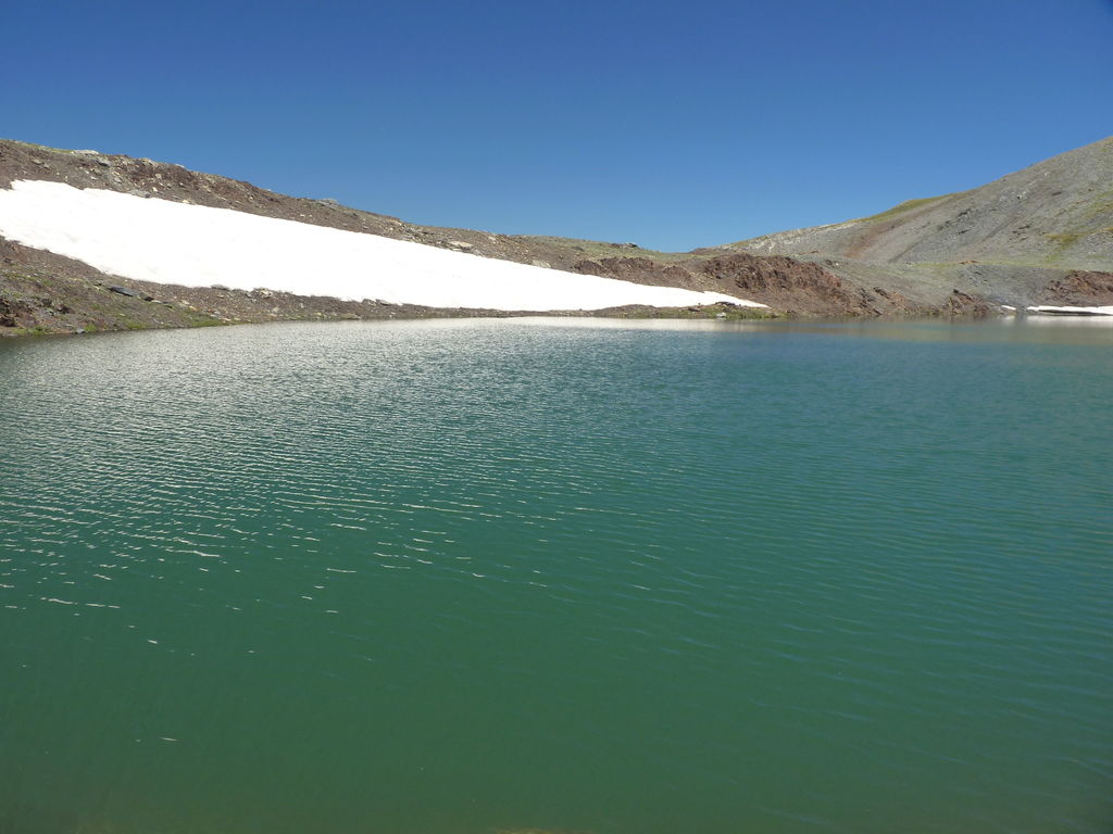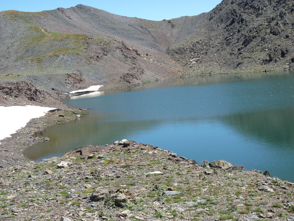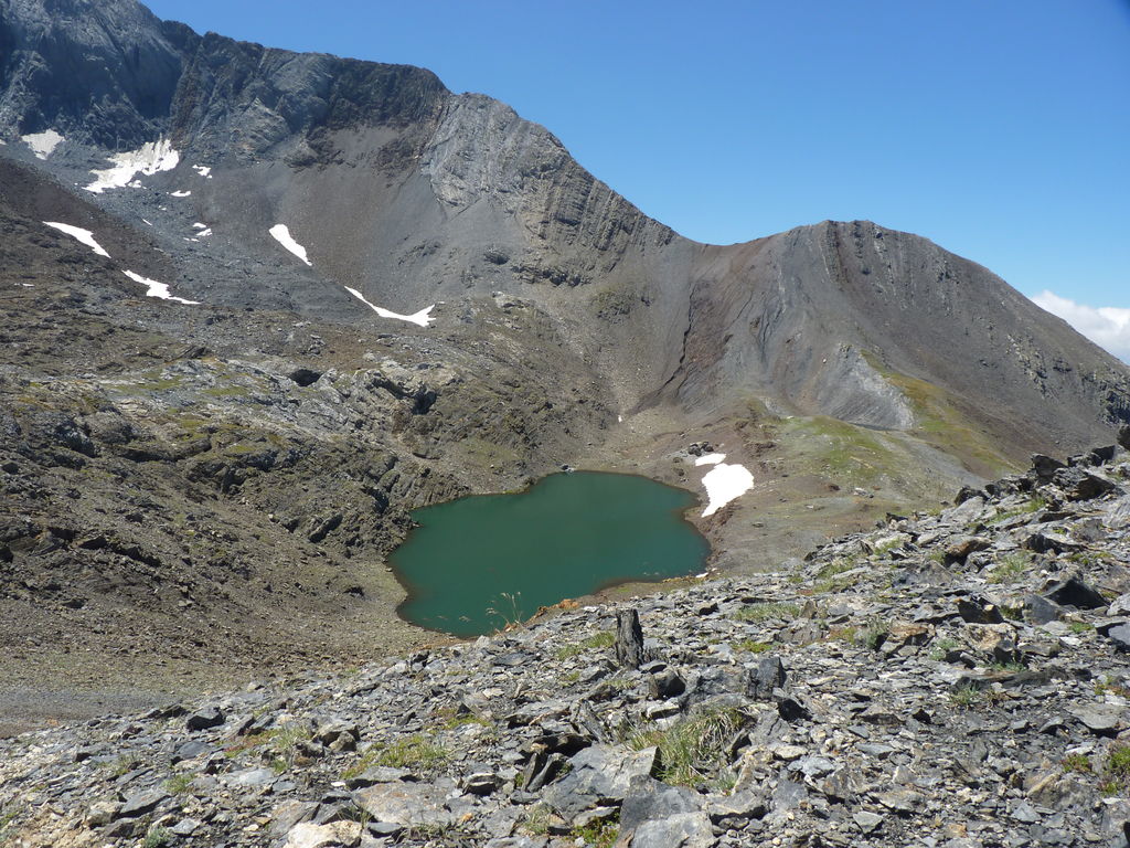 Vers 2400m d’altitude le paysage devient plus minéral et est dominé par les schistes noirs et rouges (suivant leur teneur en fer). Après un névé et un dernier lac l’ascension devient plus raide et nous devons attacher nos bâtons de marche à nos sacs à dos pour terminer la montée.