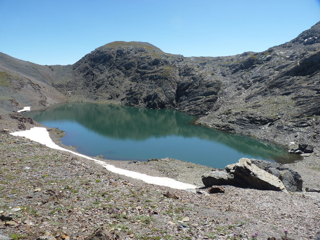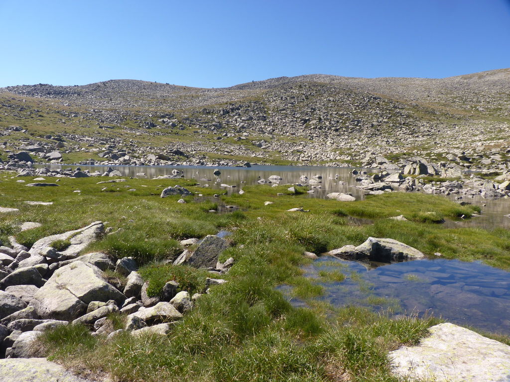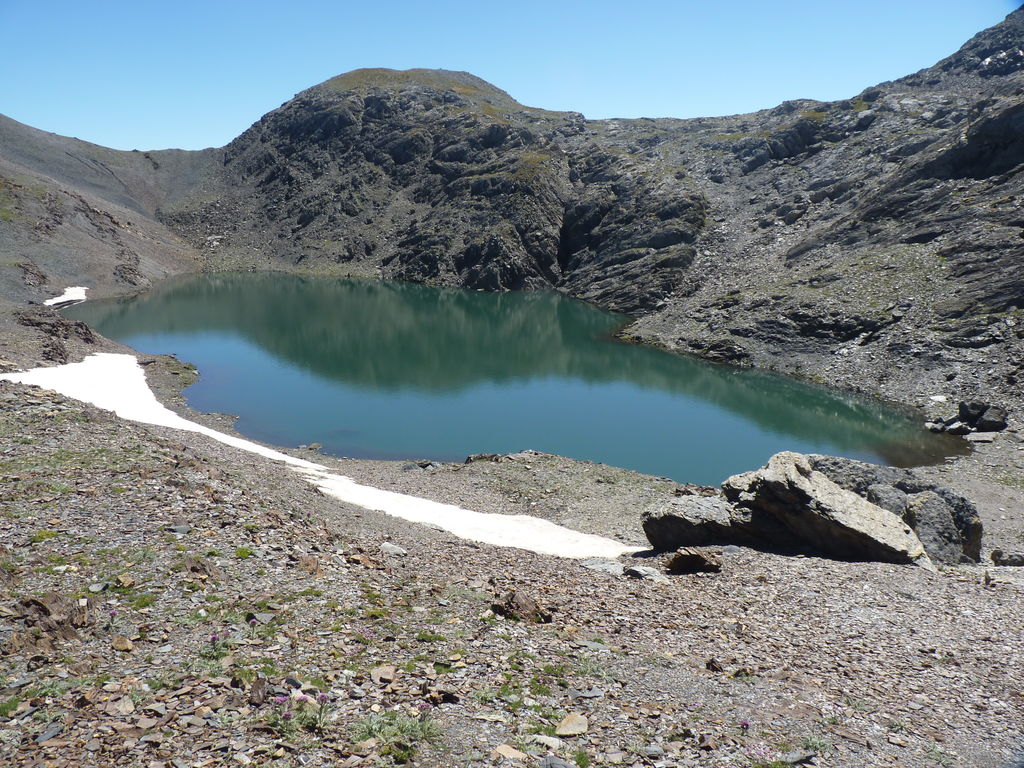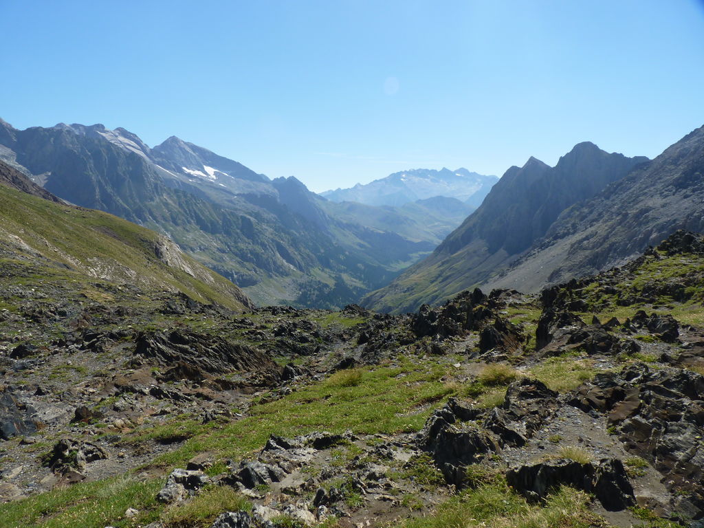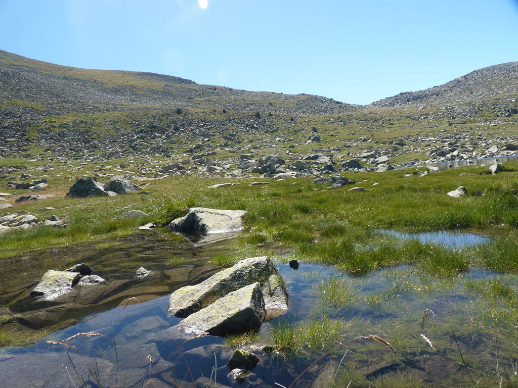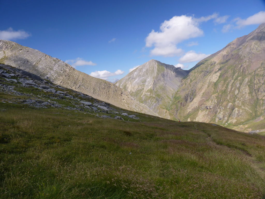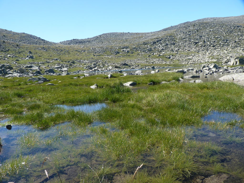 Vers 2400m d’altitude le paysage devient plus minéral et est dominé par les schistes noirs et rouges (suivant leur teneur en fer). Après un névé et un dernier lac l’ascension devient plus raide et nous devons attacher nos bâtons de marche à nos sacs à dos pour terminer la montée.